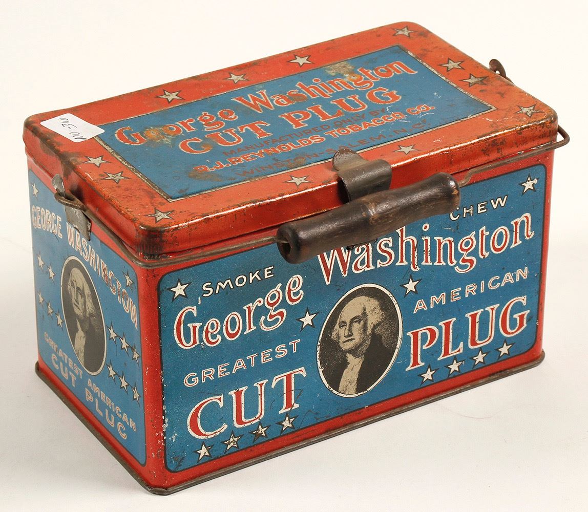This is an old and original tobacco tin can from the 1920'-1930's. It is roughly 7 1/2 in. (w) X 5 in. (h) X 4 1/2 in. (d). The tin is red, white, and blue with stars and the image of George Washington. There is some rust or pagination with one minor dent on one side; otherwise the handle and bail is still intact as well as the front clasp. A product of the R.J. Reynolds Company of Winston-Salem, North Carolina. Date: Location: North Carolina HWAC# 40742