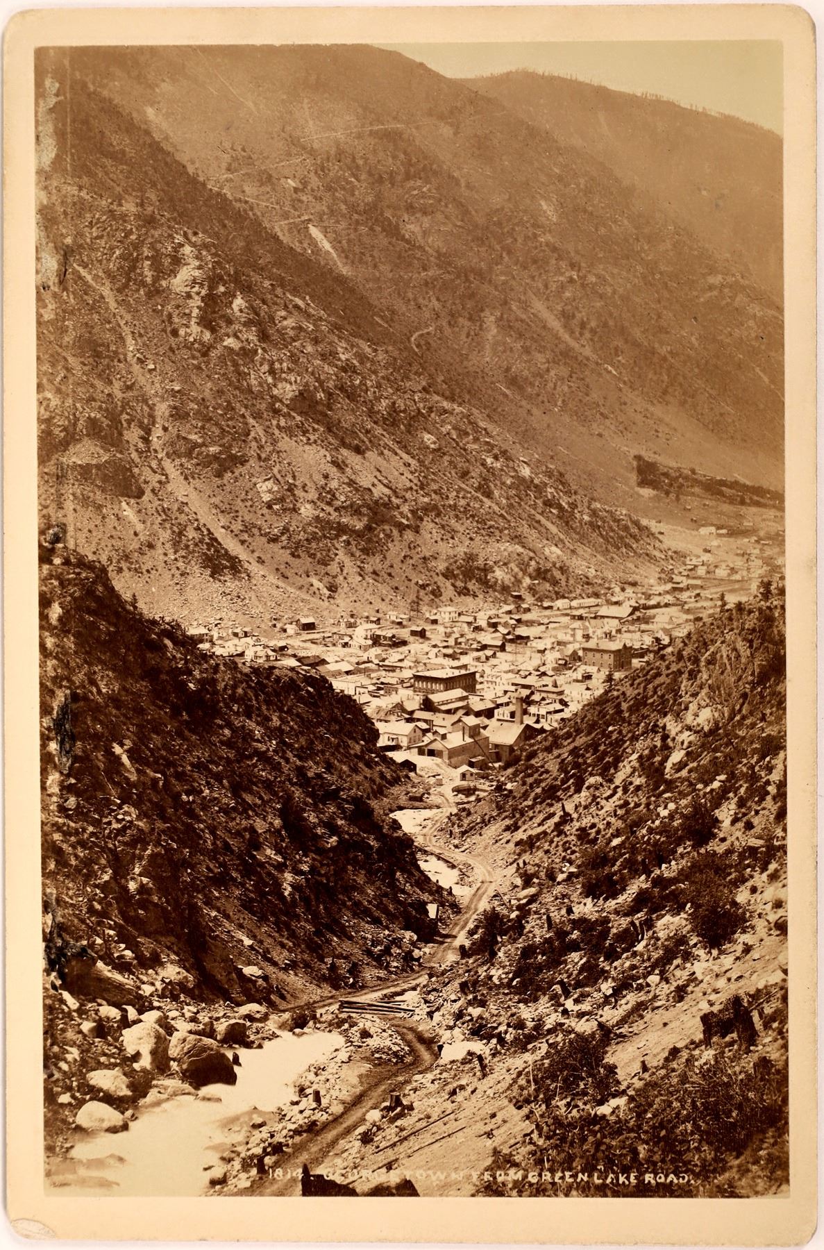 c. 1885. No. 1814. "Georgetown from Green Lake Road." High to medium contrast. Suffers from minor yellowing, but the focus is sharp. There are some minor blemishes on the left side. Pencil and pen notations on reverse and identified as WH Jackson & Co. 7 x 4.5" Photographer William H. Jackson is one of the best known photographers from the 19th century west and this image is part of his Rocky Mountain Scenery series out of Denver. Much of Jackson's Colorado work was done in the 1880s [ref: Mautz]. Located 45 miles west of Denver, the first substantial body of silver ore was found in Clear Creek County about 5 miles northwest of Georgetown in 1864. Hafen says Georgetown is regarded as Colorado's first Silver City [Colorado and its People, 336].