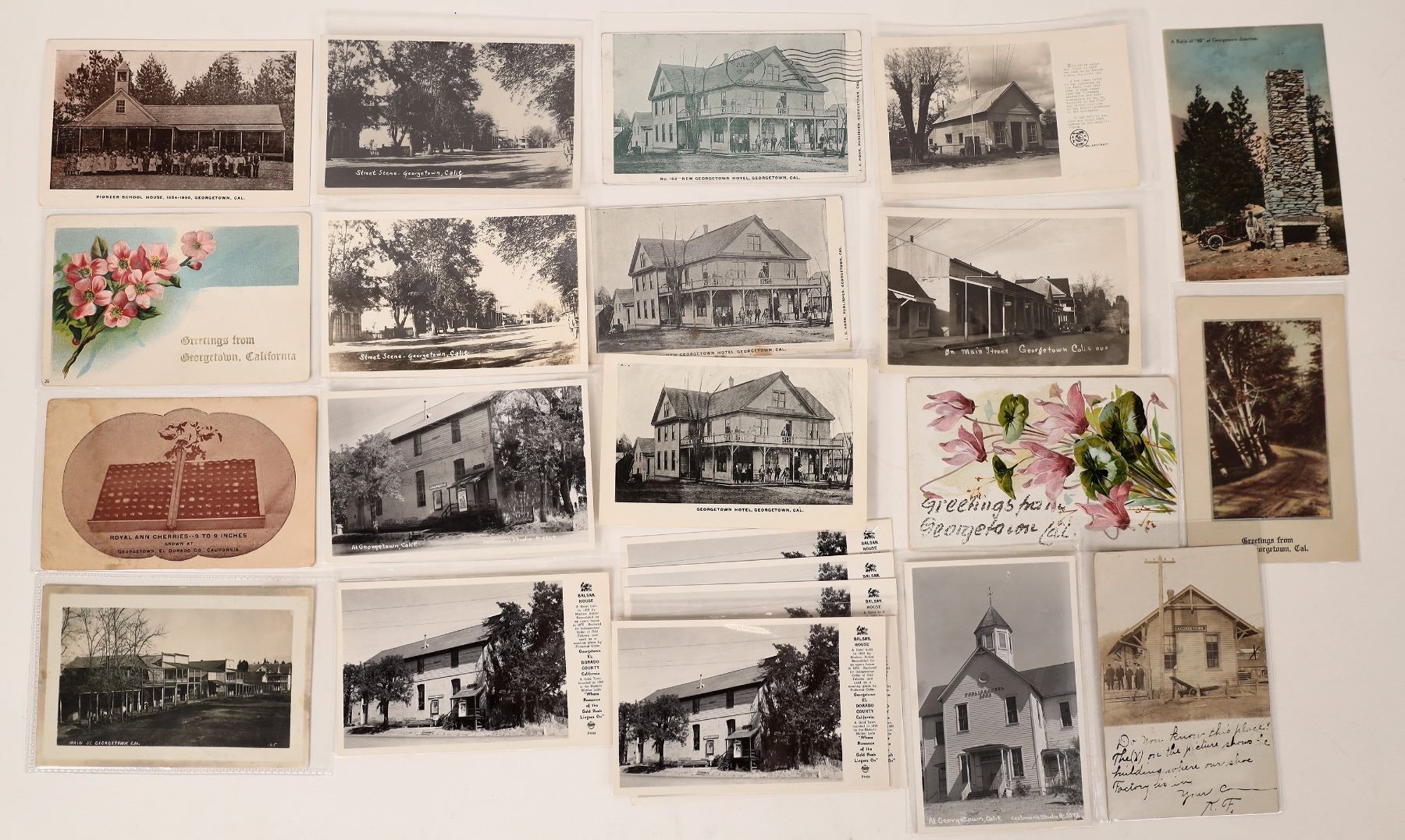 lot of 23. Thirteen RPC's, wht border. Six postmarks ; Georgetown, Cal. One card has a 2 cent stamp that has not been cancelled, and one has a Nevada First Centennial 3 cent stamp. Street Level View : Balsar house, Street scenes (4 of Main St.) , Georgetown Hotel, Old Armory from Civil War served as church until sold, town depot, school house. California 1908-51. Ken Prag Collection