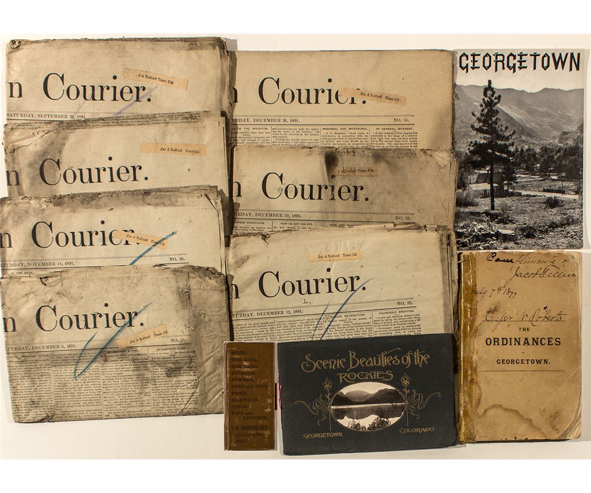 1) "The Ordinances of Georgetown Passed June 7,A. D. 1877, together with the Charter of Georgetown, and Amendments thereto: A Copy of the Patent Heretofore Issued to Georgetown. By the Government of the United States, and the Rules and Order of Business." Compiled and Revised by Edward O. Wolcott, Georgetown, Col.: printed by Jesse S. Randall, 1877. Hand written on cover: compliments of Jacob Fillica, July 7, 1877 Jasper Roberts. Cover has water damage (also inside water damage), is taped on the spine, and is torn on upper and lower right. (8.5" x 5.5") 190 pp. 2) "Scenic Beauties of the Rockies. Georgetown. Colorado". Compliments of Board of Mines and Commerce of Georgetown, Colorado; The Smith-Brooks Ptg. Co., Denver. Dark green cover, gold raised lettering, photo glued on. bound as a photo album, red string tie. Beautiful photo essay. Nice duo-tone photos. (5.25" x 8") 48 pp. 3) "Georgetown. High Points in the Story of the Famous Colorado Silver Camp". by Benjamin Poff Draper, copyright, 1940, Georgetown, Colorado. Center pages feature an illustration of a view of Georgetown. (9" x 6" ) 24 pp. 4) Seven copies of the Georgetown Courier. Nos. 21, 22, 28, 31, 32, 33, 34 (Sept.- Dec.) from 1891. Edges are burned, and water damaged. Label on each paper reads: J. A. Tedford Times Blk. 5) Very small advertising piece (5" x 2.25") 6 pp. black and blank. Front cover reads: Steel, Tee Rail, Ore Cars, Buckets, Powder, fuse and Caps, Picks, Hammers, Tongs, Pipe and Fittings. J. H. Burkholder, Georgetown, Colo. Back cover reads: Stoves, Stransky Ware, Tin Ware, Copper Ware, Cutlery, Paints and Oils, Brushes, Willow and Wooden Ware. J. H. Burkholder, Georgetown, Colo. Edges worn.