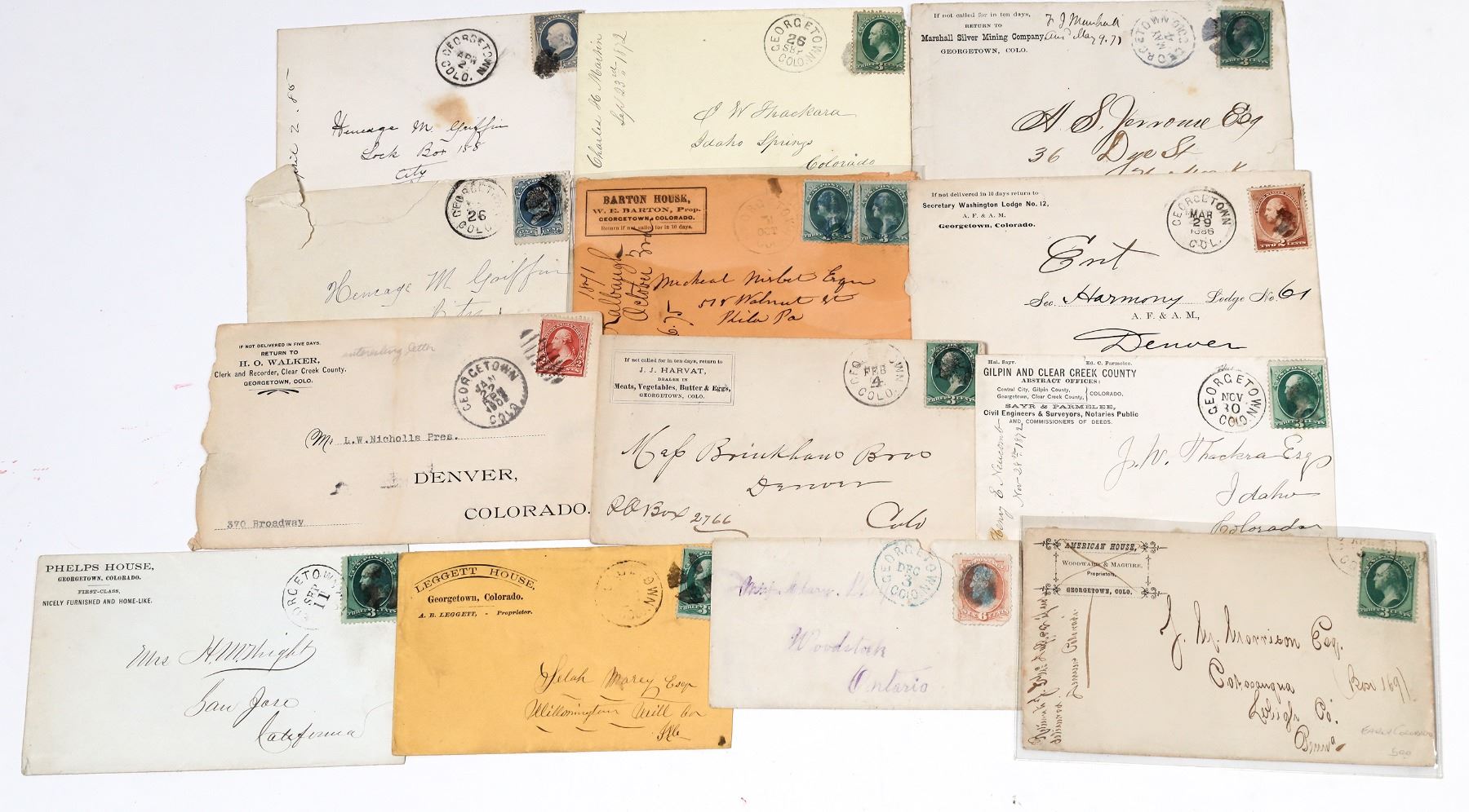 Lot of 13. No contents. Many corner advertising. Includes: American House cc; Sayr & Parmelee cc, 1872; Phelps House cc; JJ Harvat cc; HO Walker cc, 1902; Leggett House cc; AF&AM cc, 1886; Barton House cc, 1871; Marshall Silver Mining Company cc, 1871; and four other covers with Georgetown cancels, two dated 1872 and 1885. Please inspect.