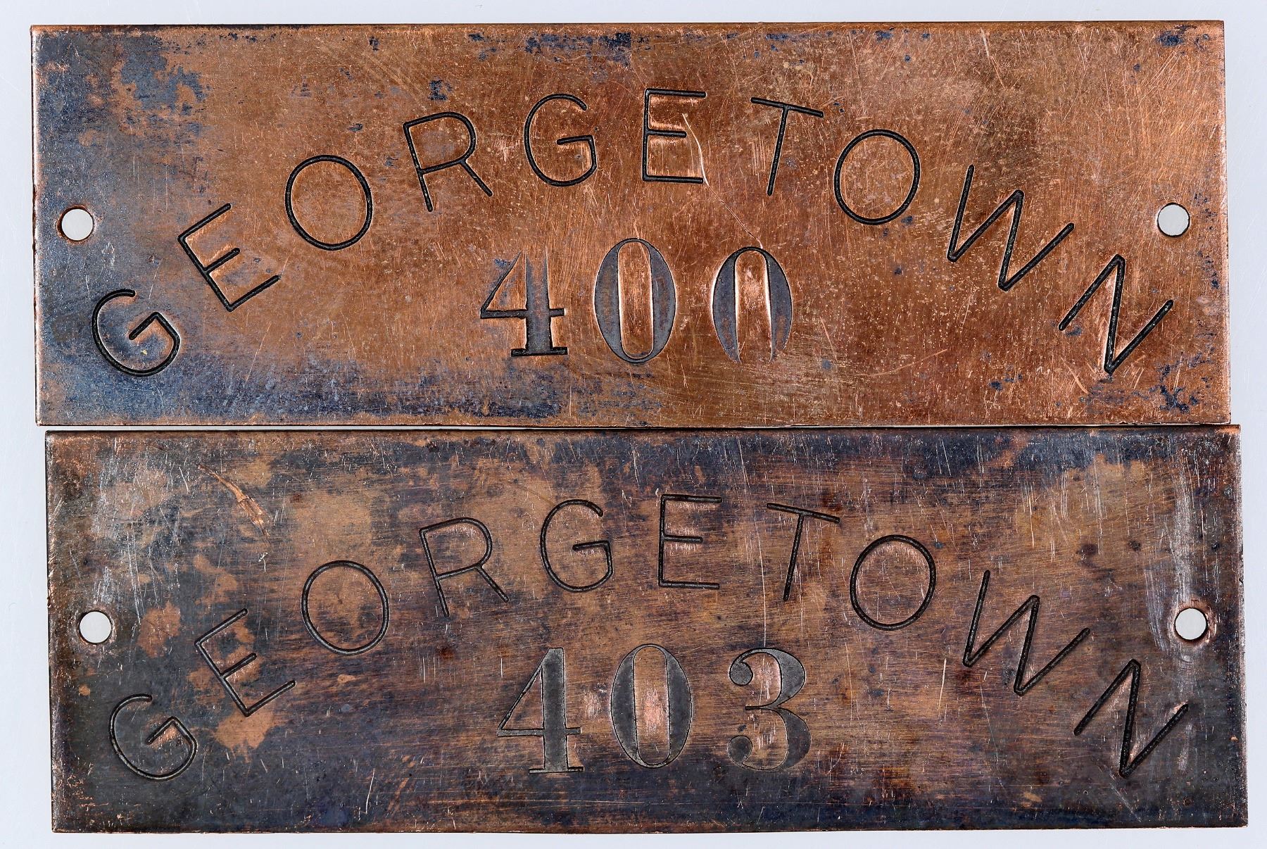 Georgetown copper hotel room tags. Georgetown 400 and 403. 1x3".