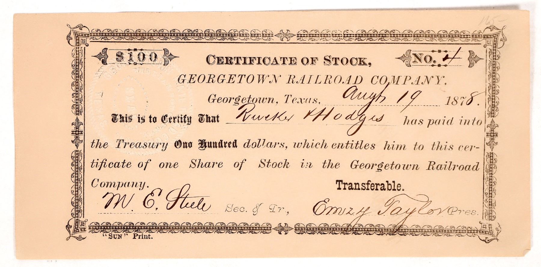 A stock certificate for one share in the Georgetown Railroad Company, made out to R. Hodges in 1878. No. 4 issued. The certificate is signed by company secretary M. E. Steele and company president Emzy Taylor with an embossed company seal in the upper left hand corner. Toning consistent with age, otherwise in good condition. Despite its success in building a railroad connecting Georgetown with the town of Round Rock, the Georgetown Railroad Company was forced to foreclose in 1879, only a year after its founding.