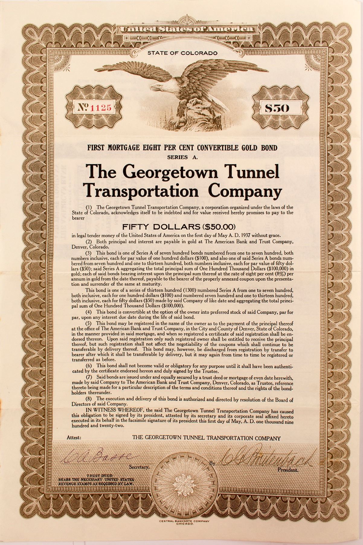 Not in Cox 1998. $50 8% gold bond. Bald eagle vignette. Colorado tunnel thru several mountains. 14.25" x 9.5". #1125.