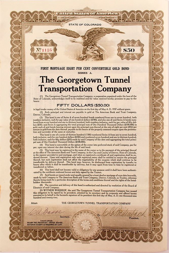 Not in Cox 1998. $50 8% gold bond. Bald eagle vignette. Colorado tunnel thru several mountains. 14.25" x 9.5". #1125. HWAC# 52314 Date: Location: Colorado