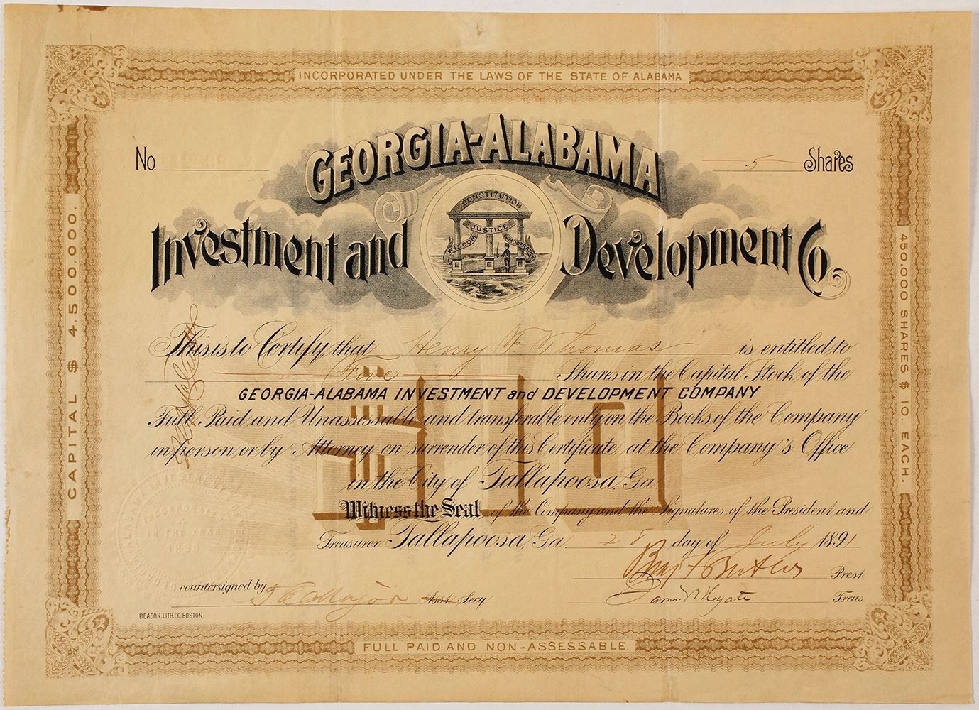 Signed by Governor Benjamin Butler Franklin of Massachusetts as president. Number 2309 issued to Henry F Thomas for 5 shares in 1891. This company was an early attempt at industrialization at Tallapoosa. By 1893 it was sold at auction - as an unsuccessful venture. Butler was a colorful and controversial character all of this life - especially during the Civil War and his occupation of New Orleans. He signed orders against women who spoke poorly of Union soldiers. He took $800,000 from the French consul that had been placed there by Southerners. Corruption was rampant for sure, but he was never indicted. He always seemed to be acting outside the law - but not so far outside to ever get in serious trouble. After the War he was the House of Representatives lead figure in the impeachment proceedings of Andrew Johnson. This lot includes an interesting biography of Butler and a copy of a report to the stockholders in 1891. (Al Adams Gold Rush Memorabilia Collection) Date: 1891 Location: Tallapoosa, Georgia HWAC# 57319