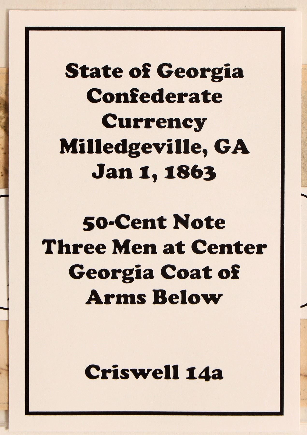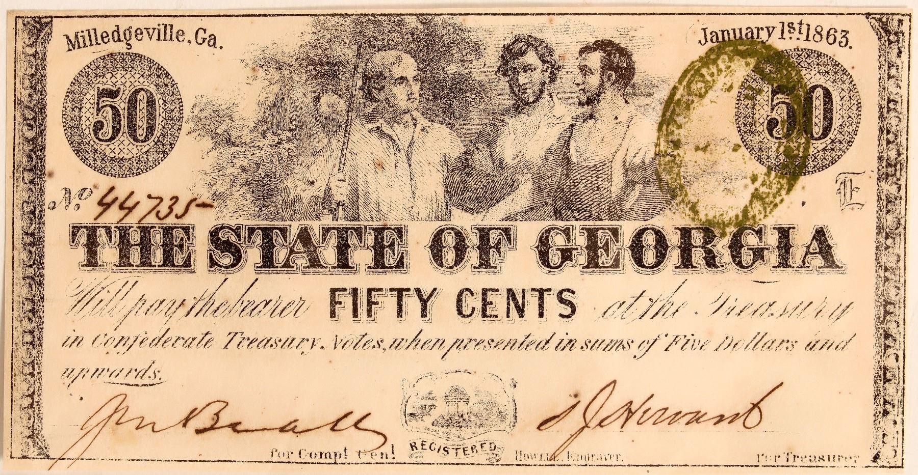 Confederate currency from Milledgeville, Georgia, Jan. 1, 1863. 50 Cent Note. Apparent grade-Choice, Crisp Uncirculated. Criswell-14a, Haxby-Unlisted. (Serial No. 44735). Three Men at Center, Georgia Coat of Arms below. [Milledgeville] [Georgia] [] [] []