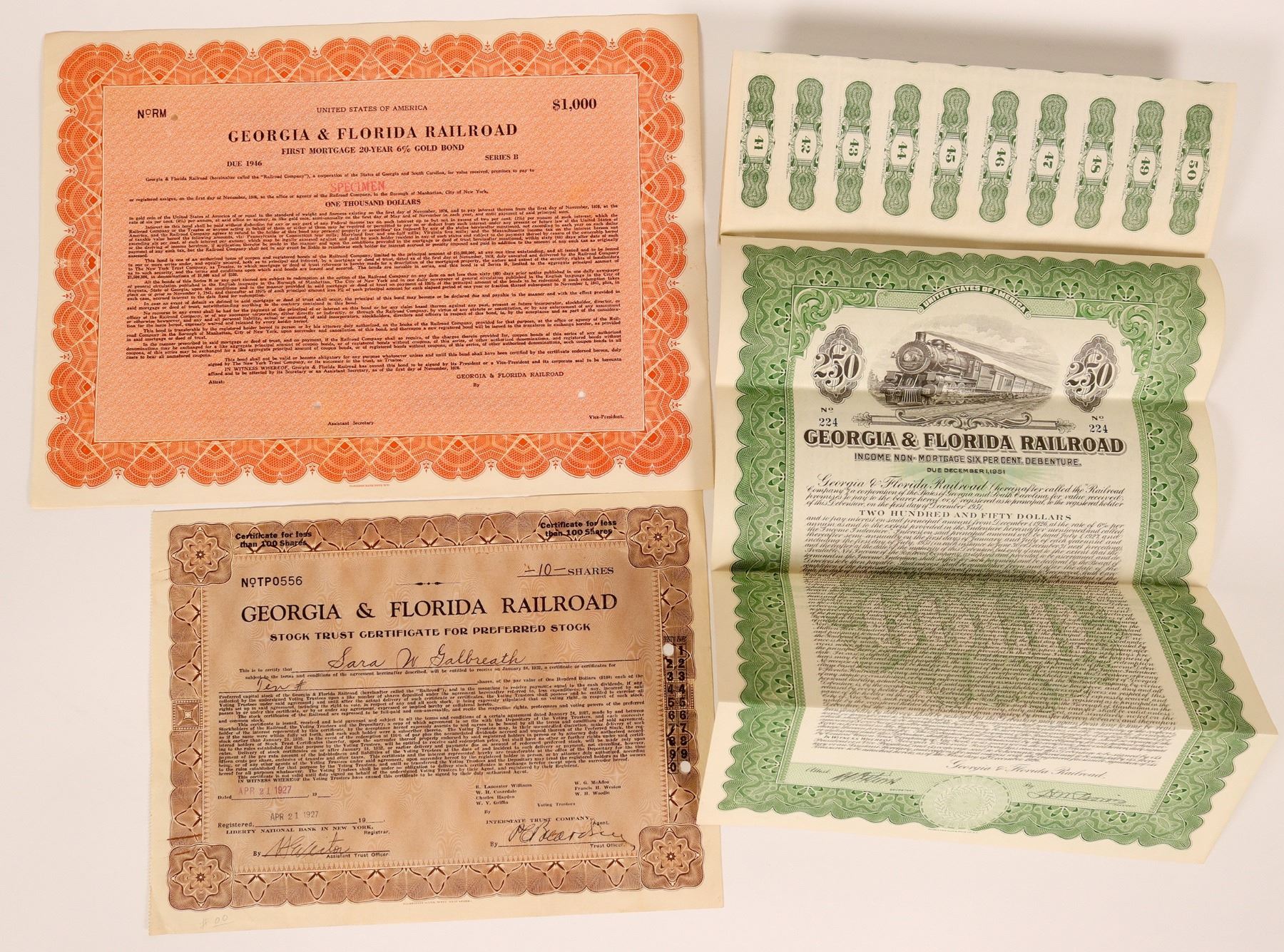 3 certificates. Incorp 1906. The Georgia and Florida Railroad was a railroad in the Southern U.S. The Southern Railway gained control of the G&F in 1963 and reorganized it as the Georgia and Florida Railway. It was merged into subsidiary Central of Georgia Railroad in 1971. #TP0556, I/U, Brown , common stock, issued April 21, 1927, no vignette Hamilton Bank Note printer. . # RM , I/C, specimen, Orange, 6% 20 year Gold bond.dateline Nov. 1926. 224, I/U, $1000 6% Denture Bond , Green, issued Dec 1. 1926. Vignette top train r-lCoupons 1-50 attached. Hamilton Bank Note Co printer. EF