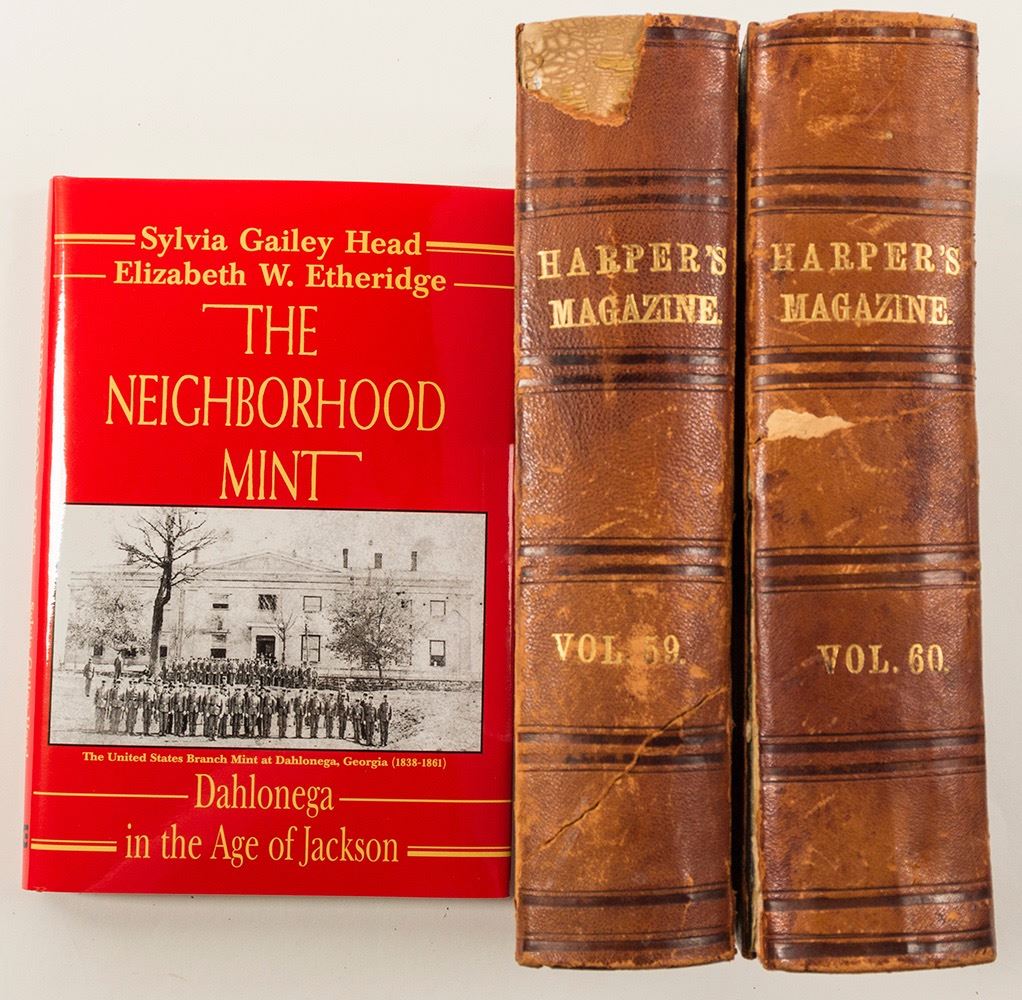 Hardcover Harper's Magazine Vol 59 June to Nov. 1879, 960 pp, spine has 2 breaks. Harper's Magazine Vol. 60 Dec. 1879- May 1880 952pp, spine is broken. The Neighborhood Mint by Head. (Al Adams Gold Rush Memorabilia Collection) Date: Location: Georgia HWAC# 58641