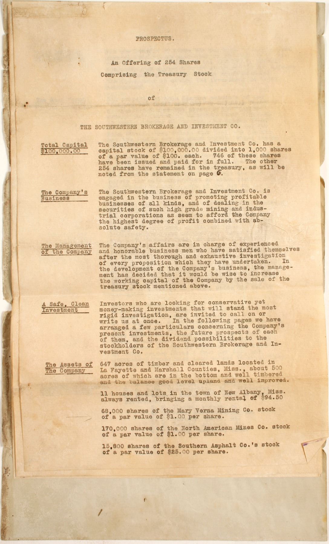 Initial 5pp typed prospectus for the Southwestern Brokerage and Investment Co., 1907. The company was composed og mostly Georgia men, who put assets into this company. The assets were stock in two mining companies (Mary Verna Mining Co., Colorado and North American Mines Co.); an asphalt company, large plat of land in Mississippi, block of 11 houses in Mississippi. The Colorado property is the Copper Queen Mine (n/l in Vanderwilt), and most of the officers are from Georgia; the North American is located nearby the Copper Queen, also with Georgia officers. The company had good revenue from investments. City: State: Georgia Date: