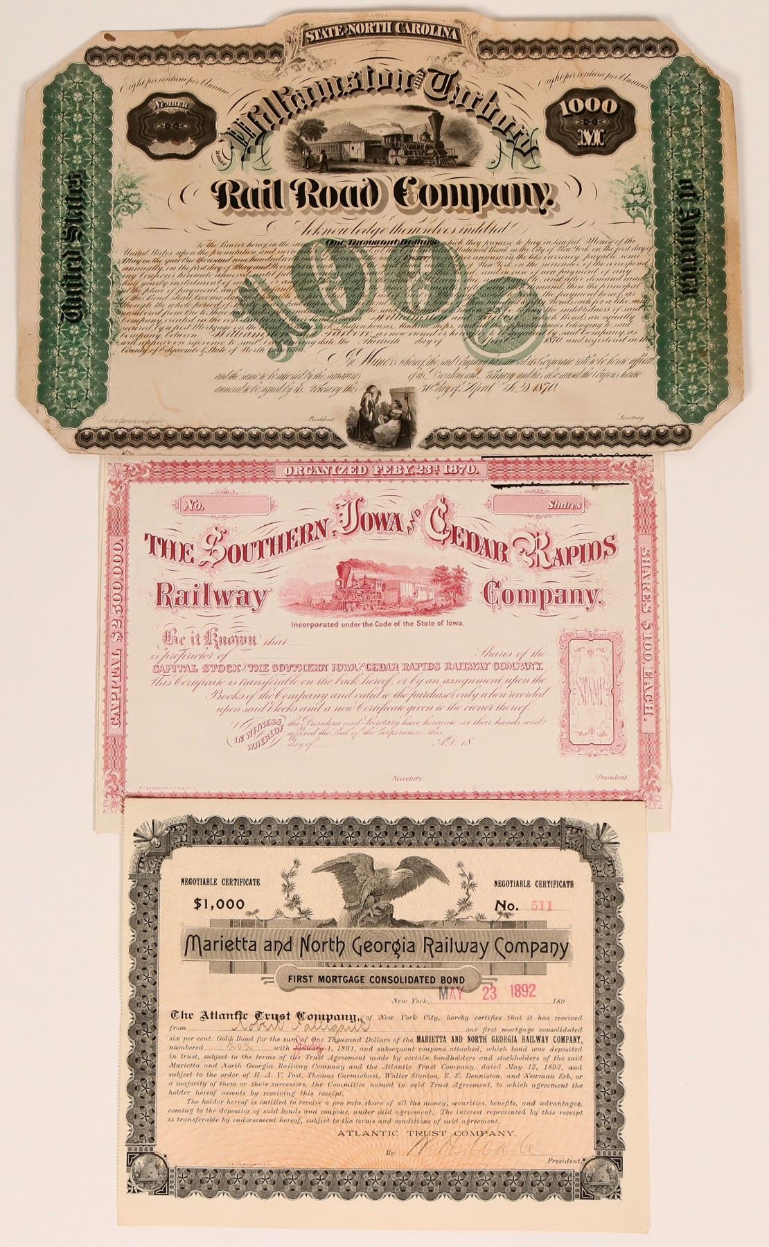 3. Marietta and North Georgia Railway Co. incorp. New York 1891 to haul from marble quarries in northern Georgia and from iron ore mines in North Carolina. #511, I/U, $1000, Negotiable Certificate for First Mortgage Bond. Issued 1892. Black, eagle vignette, no seal, orange underprint, A.B. King printer. EF-AU