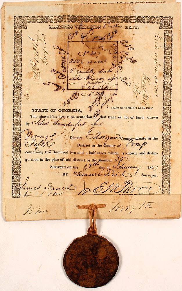 1827. Lot 307, 220.5 acres, fifth district, Troup County for second quality oak and hickory land, as noted on the survey. The lot is somewhat near the town of LaGrange, Troup County on the western border of Georgia along the road from Atlanta to Montgomery, Alabama. Awarded to John Sandafur of Morgan County, probably near Madison. Signed by EH Pierce, surveyor general. The survey is dated January 13, 1827 and was deeded 1828. Signed by Georgia Governor John Forsyth, namesake of Forsyth County, and other of the important gold counties. Medallion attached by pink ribbon at bottom. The medallion is fairly dark, with a medium strike. (Al Adams Gold Rush Memorabilia Collection) Date: 1827 Location: Troup County, Georgia HWAC# 57040