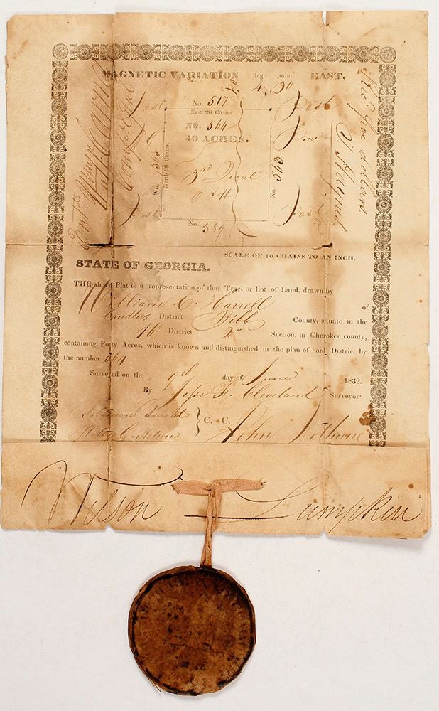 Survey date June 9, 1832 for Lot 564, a 40 acre parcel in the 16th District, 2nd Section of “third quality” land of oak and Hickory trees (O & H). Signed on the bottom fold boldly and in large letters, by Wilson Lumpkin, the Georgia Governor and namesake of Lumpkin County, the most famous of all the Georgia gold counties. No printer shown on the survey, which is significantly damaged by deterioration along folds and discoloration in the same areas. Remarkably, there is not foxing associated with the medallion. The deed document was executed in 1834. The property was a gold lottery lot north of the Chattahoochee River In Cherokee County near the Little River. Little River is an Etowah River tributary. (Al Adams Gold Rush Memorabilia Collection) Date: Location: Cherokee County, Georgia HWAC# 57029