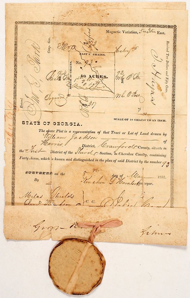 1832. Lot 93, 40 acres, First District, third section Cherokee County (Cobb County today), won by William Jackson. The survey is dated May 8, 1832, deeded in 1837 and signed by Georgia Governor George R. Gilmer, namesake of Gilmer County, in 1837, also governor in 1829-1831. Two creek branches are shown on the survey with the notation of 1st class land. The property is is the very southern part of the gold lottery sections. Trees include dogwood and oak. This document has split along a horizontal fold, with many more splits and cracks. The second document, the deed, is similarly affected, though no separation has taken place. There is attached with the usual pink ribbon. (Al Adams Gold Rush Memorabilia Collection) Date: 1832 Location: Cherokee County (Cobb), Georgia HWAC# 57034