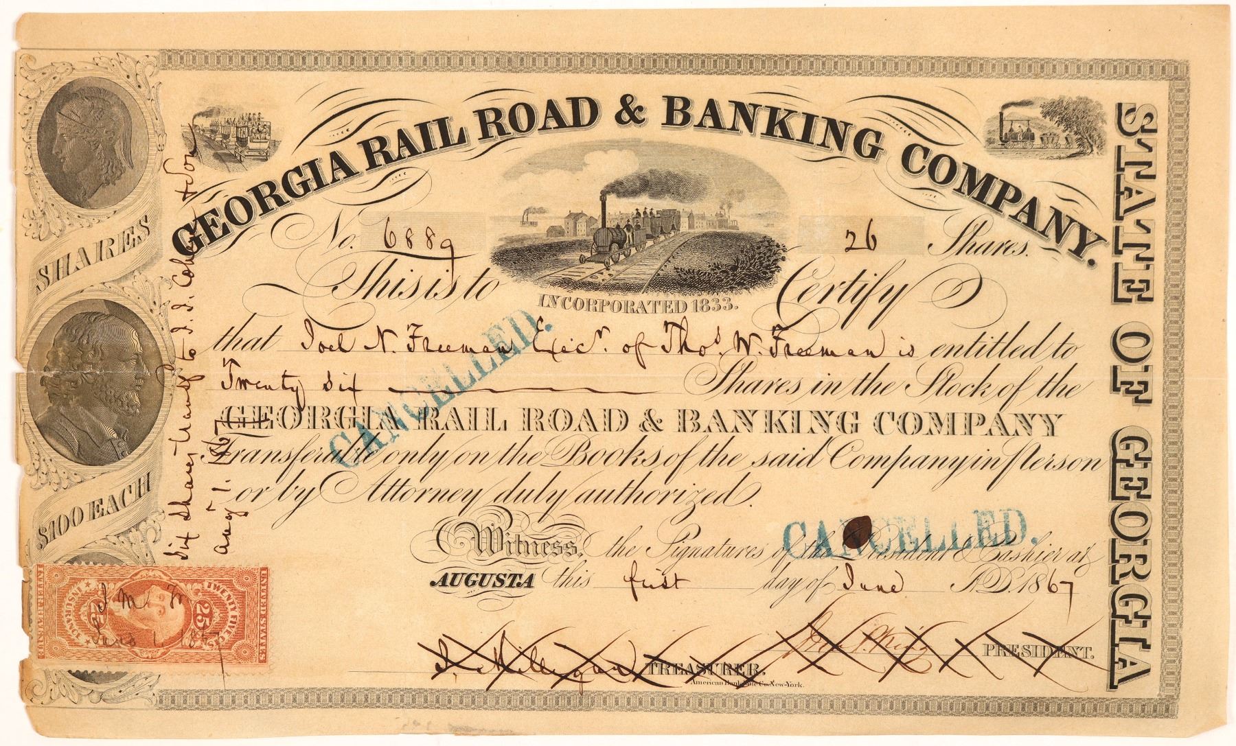 26 cancelled shares of Georgia Rail Road & Banking Co cert. #6889 issued to Joel N. Freeman exec of Thos W. Freeman @ $100 each dated June 1, 1867 . Adhesive RN stamp. Vignette of train on rails with city in background. Two small trains on both side of top. Two allegorical male figures on left side of certificate. Gray border. Company chartered in 1833 in Augusta, Georgia. In 1835, the charter was amended to include banking. Originally the line was chartered to build a railroad from Augusta to Athens, with a branch to Madison. In 1967 it reported 833 million revenue-ton-miles of freight and 3 million passenger-miles. By end of year it operated 331 miles of road and 510 miles of track.
