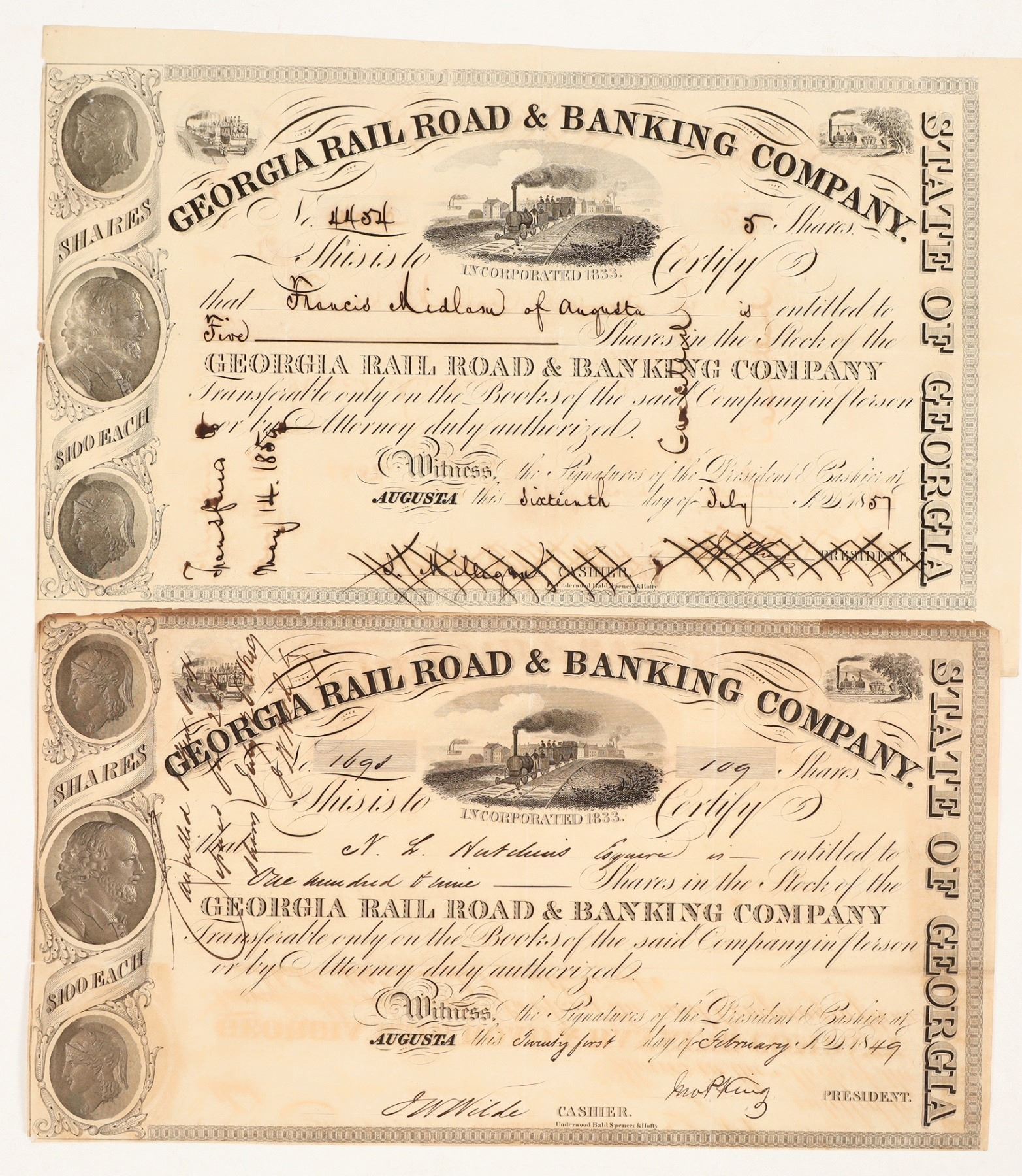 Issued to Francis Midlam of Augusta for five shares in the Georgia Rail Road & Banking Company. Railroad vignette