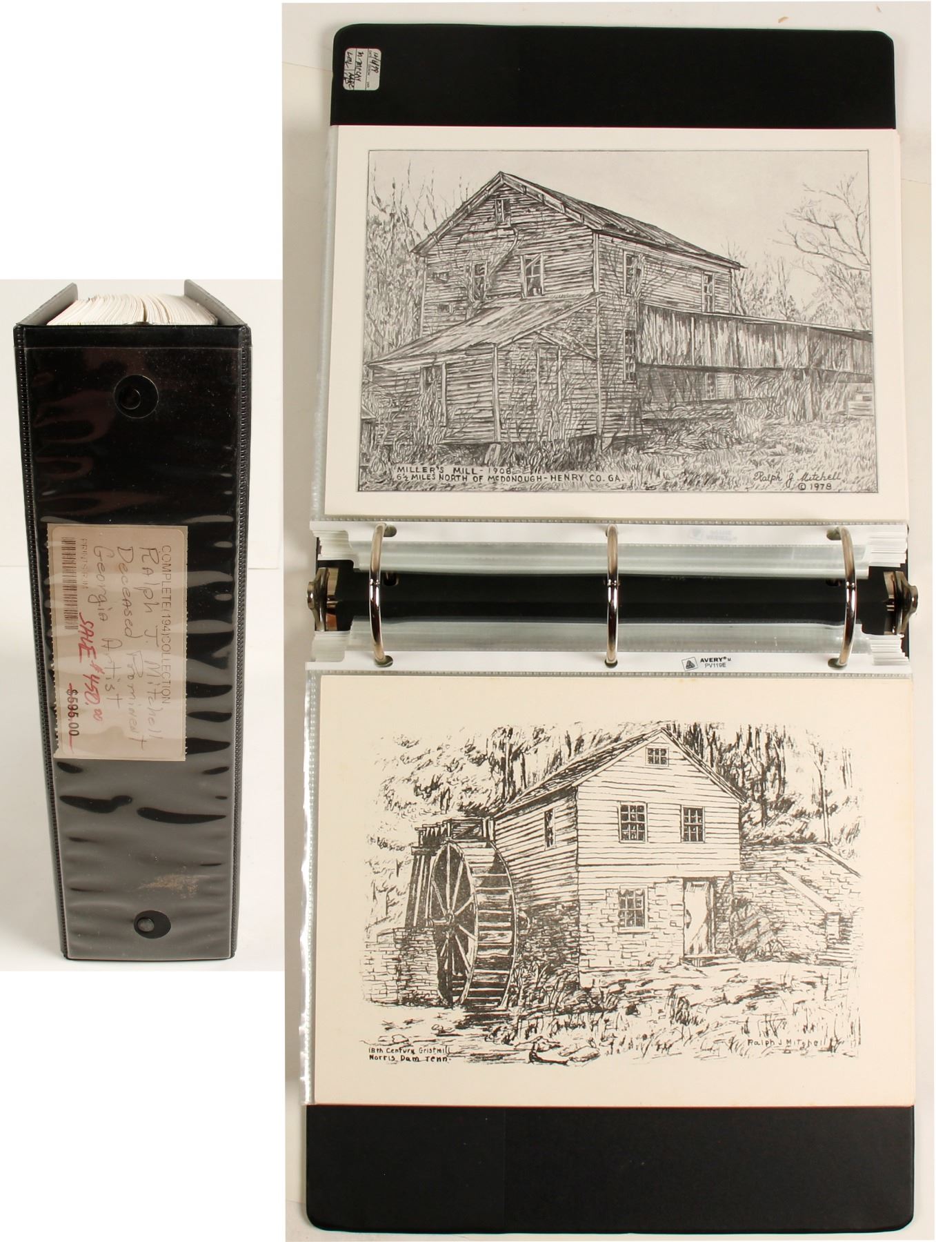 This binder contains 194 sketches by artist Ralph Mitchell in c1970's & 1980's. Mitchell's subject for this portfolio is the state of Georgia. These pencil sketches capture fine details & the atmosphere of the Old South. A wonderful, historical collection. You can visit the placer gold mine area of Georgia, Frederica, Sea Board Coastal Railroad, Prather's Covered Bridge, Blind Susie Covered Bridge, lots more covered bridges, Akins Mill at Statesboro, Governor's Mansion in Midgeville, plantations, Fort Pulaski, Bulloch Hall (Home of President Theodore Roosevelt's Mother) & many more. These are done on heavy card stock and measure 8.5"x 11".