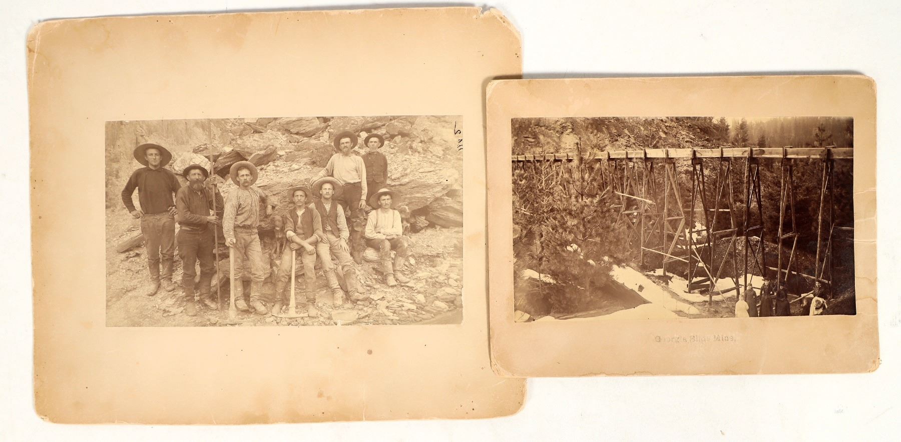 Lot of 2 different. The first is a 4.5 x 7.75" photo (9 x 11" mount) by L. Reinhard showing a group of eight miners at the mine location, c1870-'s."L. Reinhard, Georgia Slide" is stamped on the reverse. The second is 4.25 x 7.25" photo (6.5 x 8.5" mount) by George D. Stewart, a photographer located in Sacramento during the 1890-'s. It shows a number of women and children by a flume used by the mine. Stewart's company stamp is on the reverse. The quartz deposits at Georgia Slide were mined on a large scale by hydraulic mining from 1853 to about 1895 yielding some $6 million. The mine, located in the Georgetown district, is in northwestern El Dorado County at the north end of the northeast segment of the Mother Lode belt. It extends from just north of Garden Valley north through Georgetown and the Georgia Slide area to the Middle Fork of the American River and is both a lode- and placer-mining district. Georgia Slide was also the name of a mining town lost to history and is located close to Georgetown. Mining began here in 1849 by a party of placer miners from Oregon. The site was first known as Growlersburg but was soon changed to Georgetown. It is reported to have been named for either George Ehrenhaft, who laid out the town, or George Phipps, a sailor-prospector. The placers were highly productive during the 1850s. The seam deposit at Georgia Slide was 1000 feet long and 500 feet wide. Usually the milling ore yielded from 1/7 to 1/5 ounce to the ton, but many high-grade pockets were encountered. In addition, there are several wide quartz veins containing finely disseminated free gold and pyrite. These veins contained ore shoots with stoping lengths of up to 500 feet. The Tertiary gravel patches yielded gold.