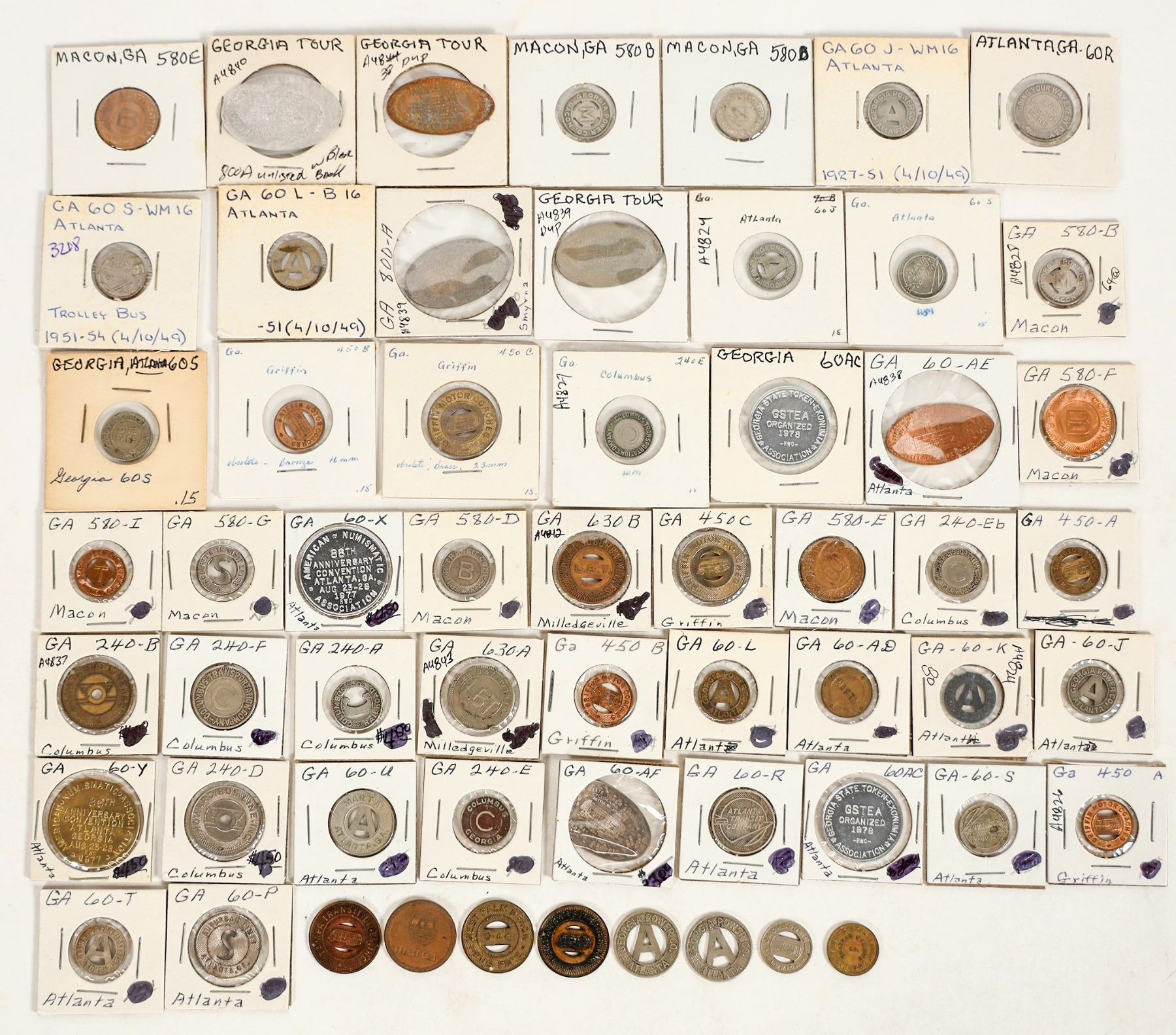 Group of 57 transportation tokens from various Georgia companies as well as souvenir medals/coins from Georgia. See photo for details.