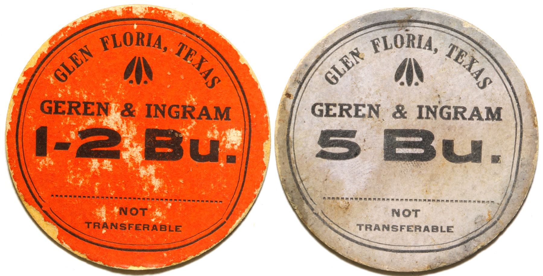 Glen Flora is west of Galveston. 2 paper tokens, 5 Bu & 1-2 Bu. State: Texas City: Glen Flora Date: HWAC# 52074