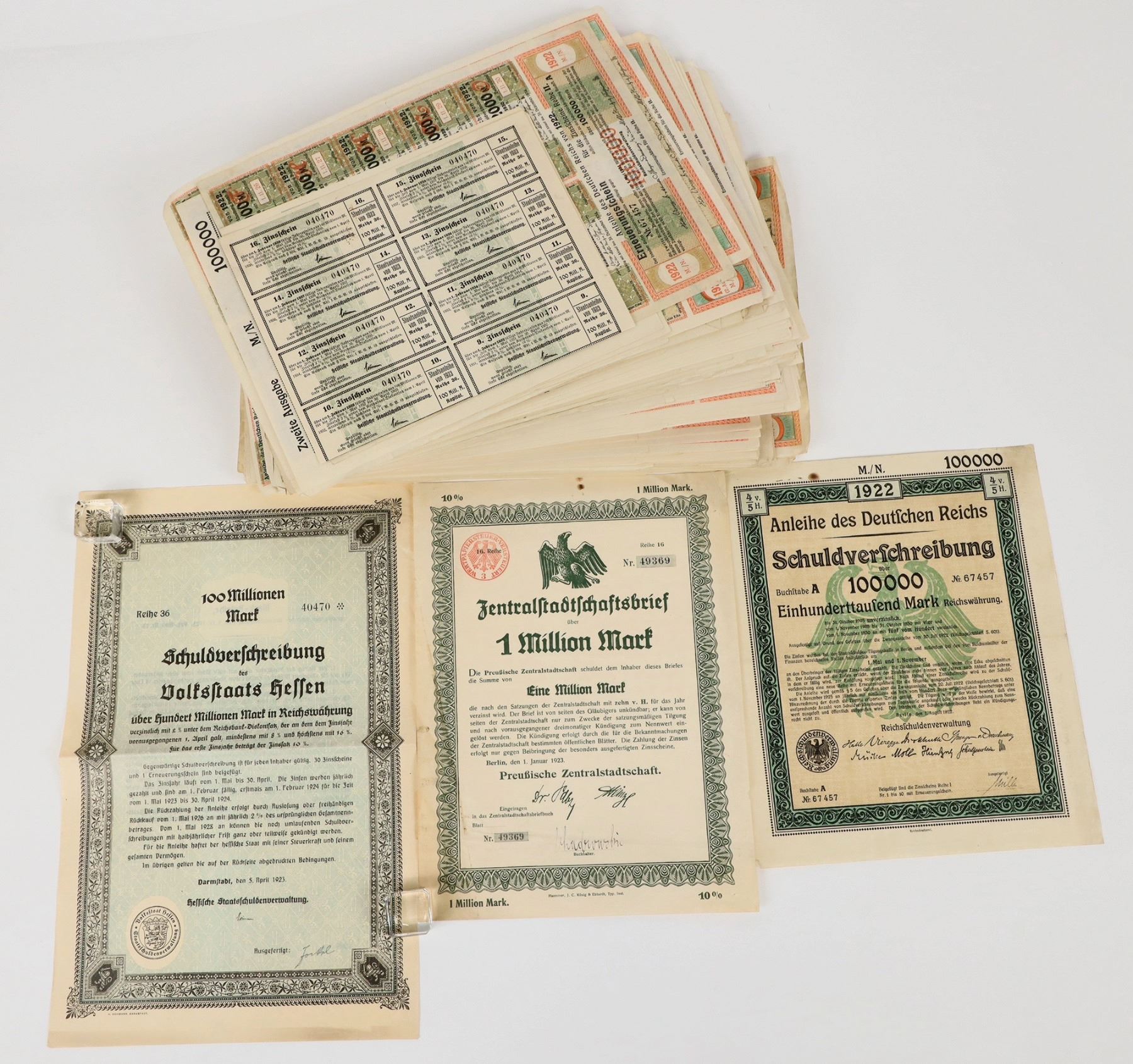 Large lot, approx. (+200) certificates, 100,000 Bond note with coupons. the "Schuldverfchreibung" note, comes with a full sheet of 2000 M numbered coupons. Listed as "Zweite Ausgabe (Second Output) Anleihe (Bond) Schuldverfchreibung (Preservation of the Empire) for (Einhunderttaufend) $100000 Marks. Second variant in this lot is a bond for 100 Million Marks, dated 1923. Graphics are similar to above. Historic, great clarity and color, please see photos.