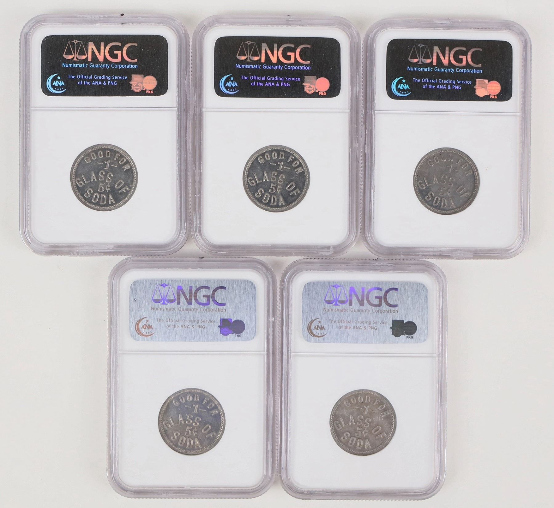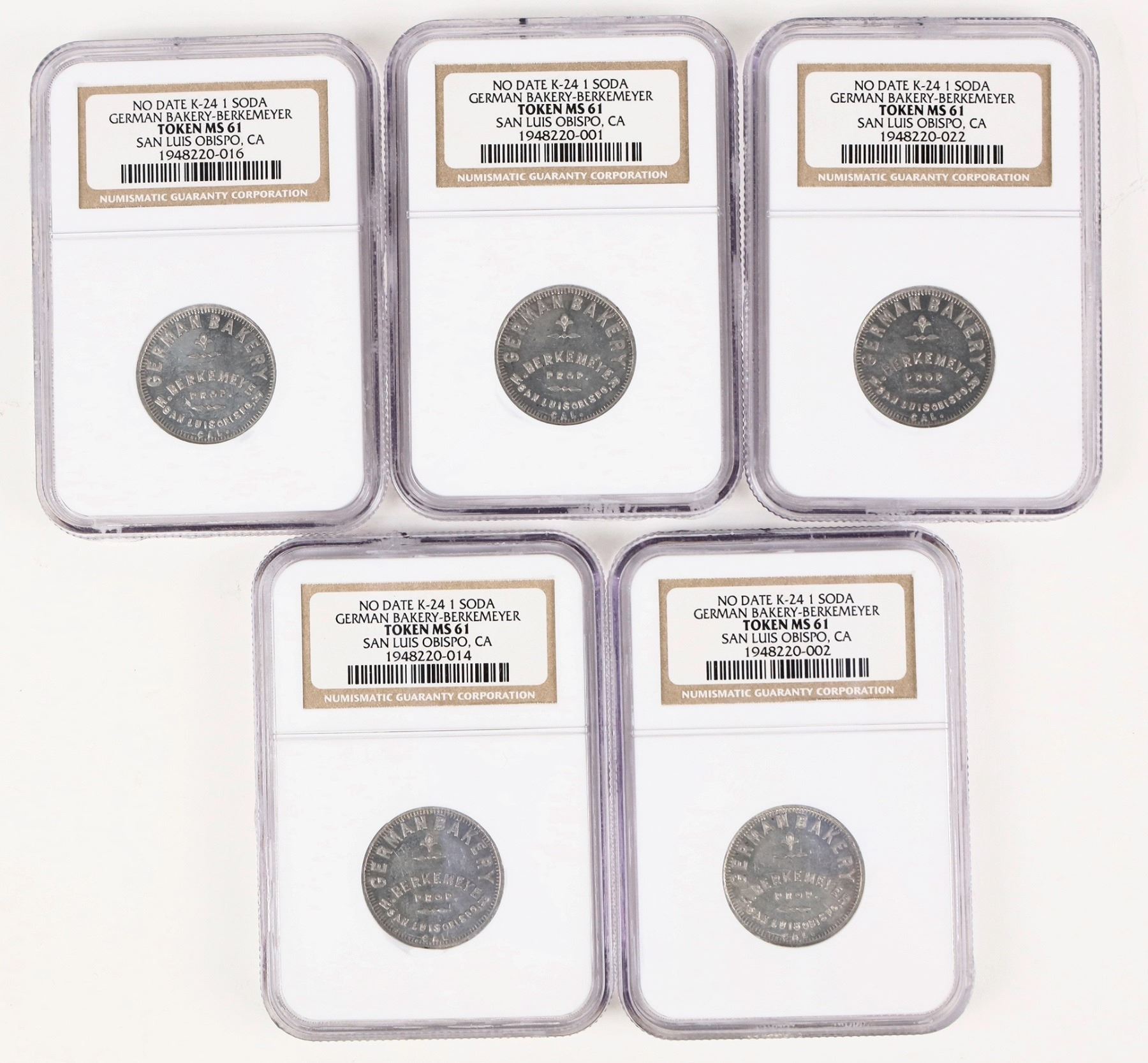 Five tokens graded MS 61 by NGC. German Bakery-Berkemeyer; San Luis Obispo. Good For one glass of 5c soda.