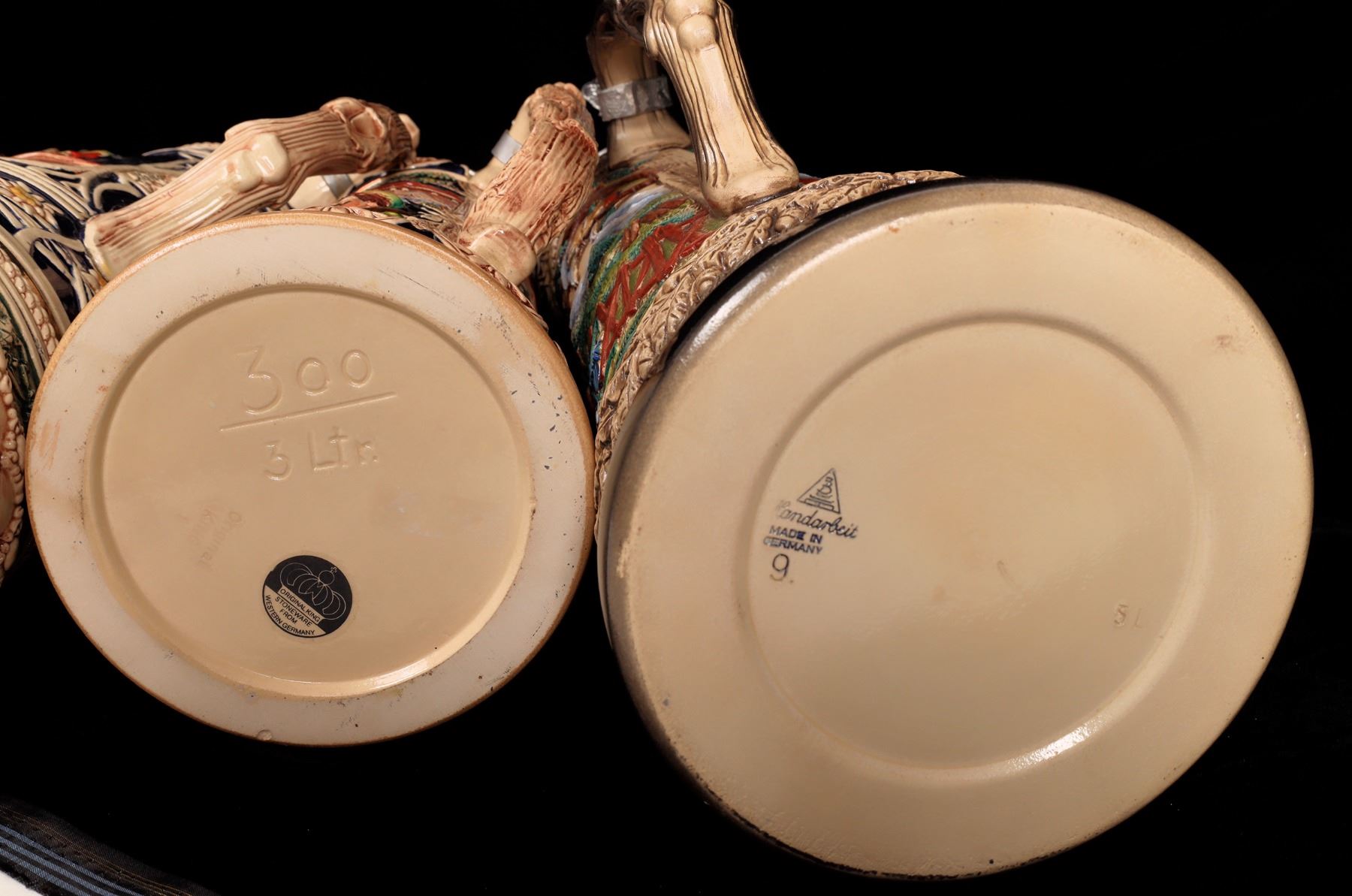 4 very large German beer steins. 3 scarce 4 litre-1 with metal dome like top, 21.5", marked on bottom Handarbeit. Green ceramic top, 21" tall, marked Gerz on bottom, s/n 3661 behind handle. Metal bell like top, 21.25", triangle bottom mark. 3 litre-hunting couple, 18.5", marked Original King on bottom. No apparent chips or cracks. About 33 lbs.
