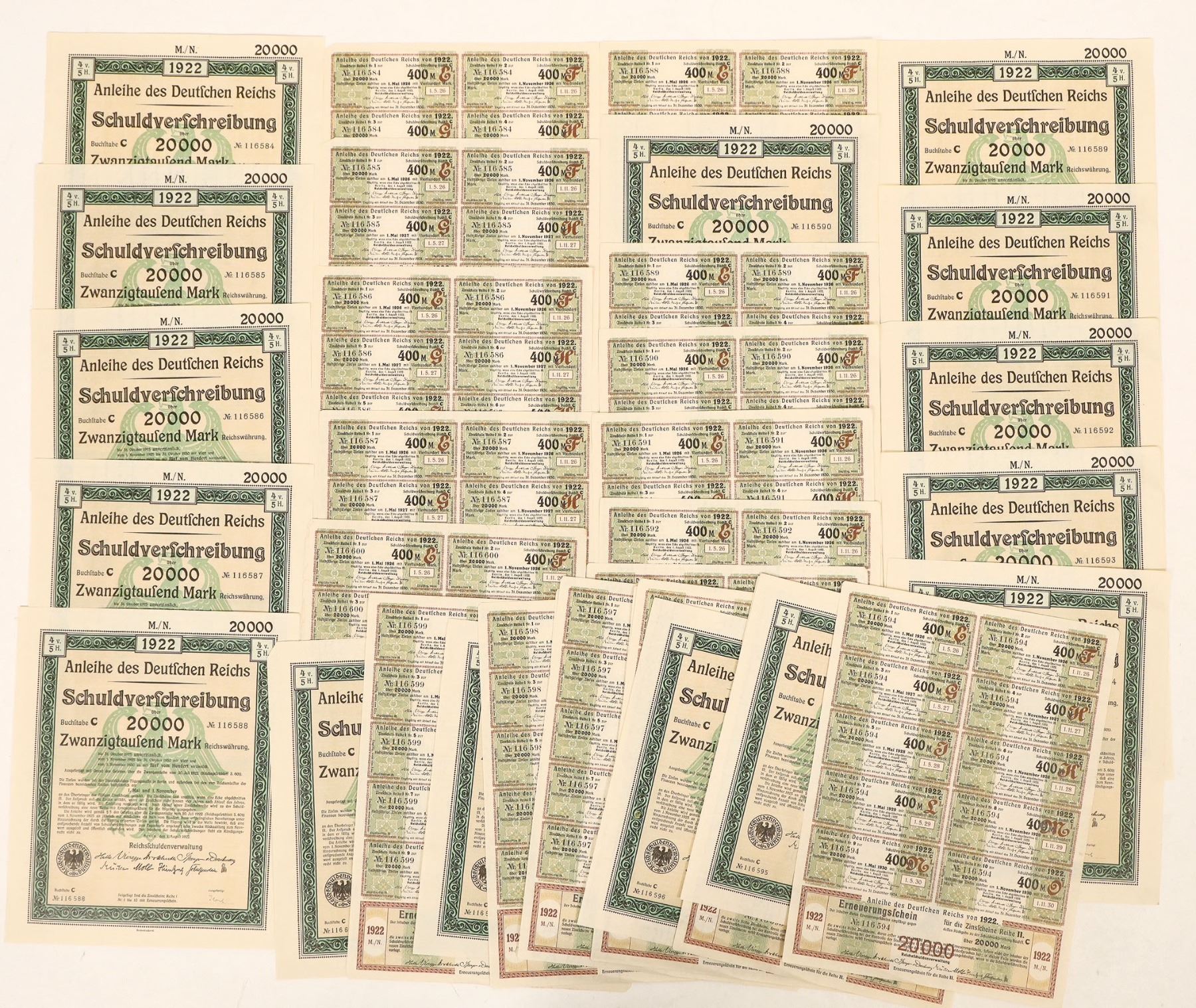 Lot of 16. All I/U, in exc. cond. In consecutive order w/matching coupons from 116-584 to 600. Green underprint and black stamped seal coat of arms, printed signatures of the Reich Administration.