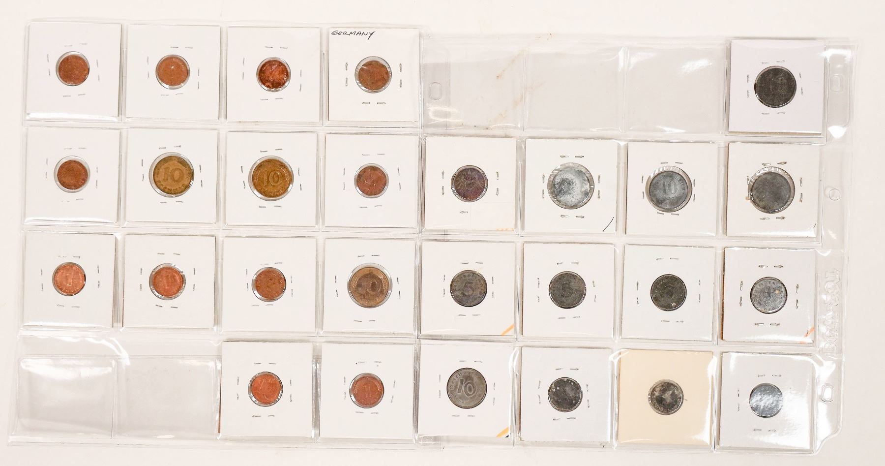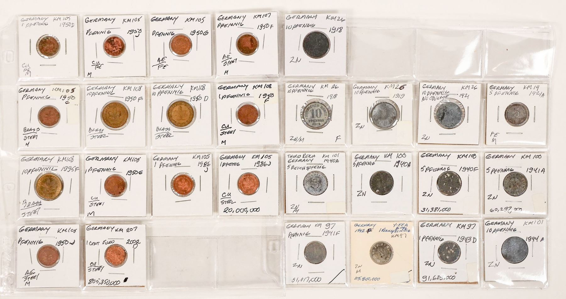 Twenty seven German coins in 2 x 2 cardboard with Kruse/Mishler catalog number, date and denomination. From 1918 through World War Two, up to 2002. One, five or ten pfennig.
