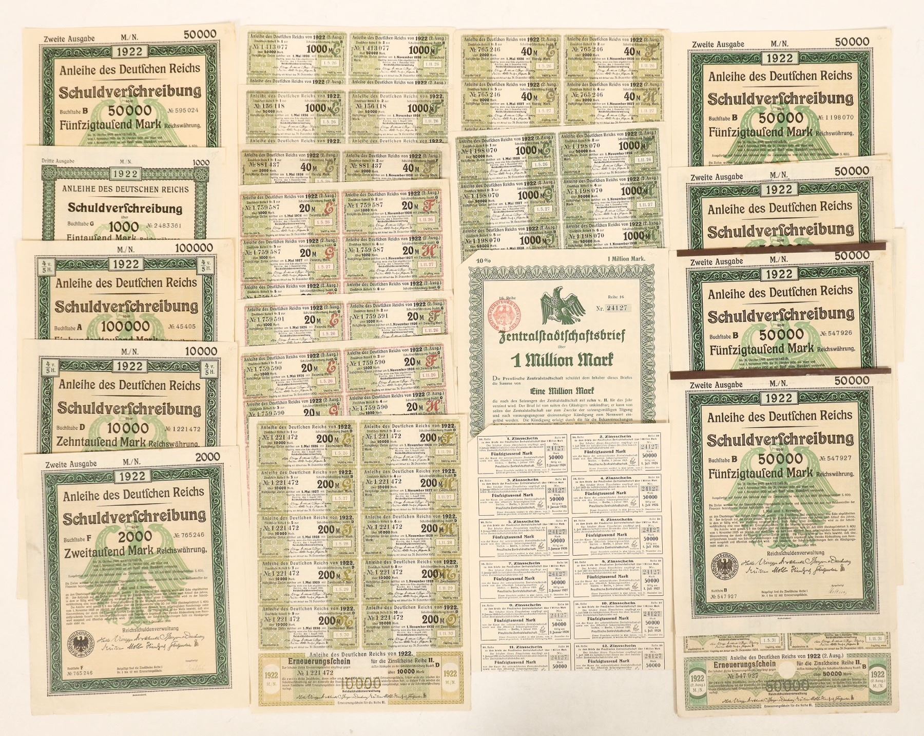 Lot of 16. All I/U Denominations form 2,000 to 50,000 marks. All are in exc. cond. Some have the cert. and matching number coupon page. Others are unaffiliated coupon pages and cert. Reich is the printer.