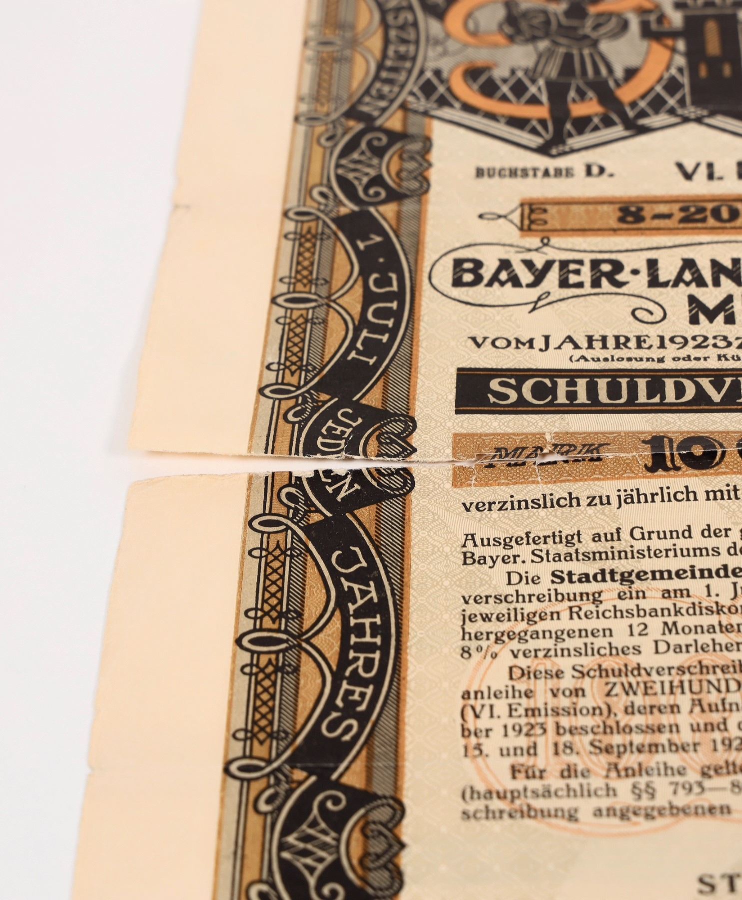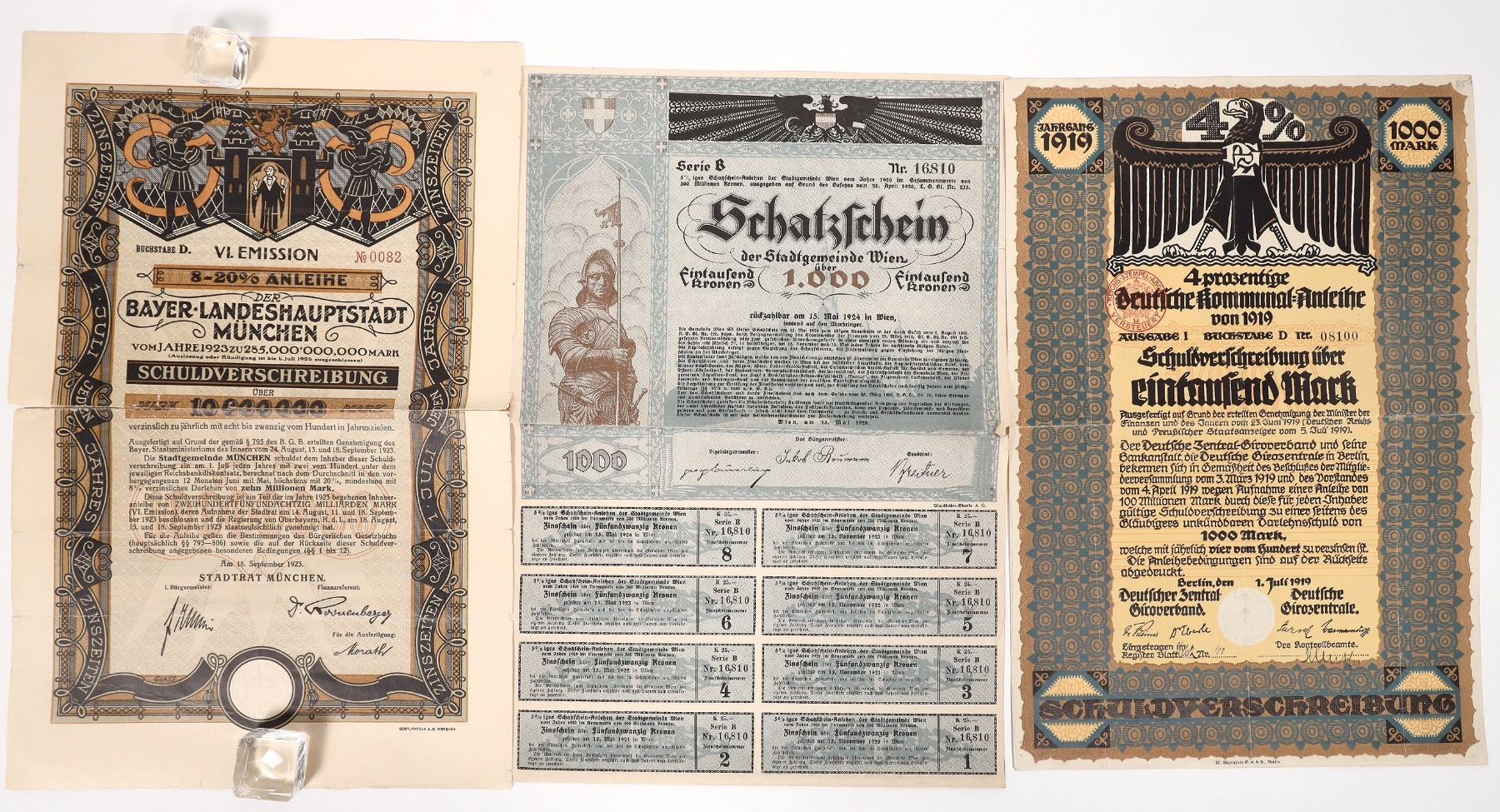 Group of 3 bond certificates from the German Empire, dating 1919-1923: a City of Munich bond, City of Vienna treasury note, and German municipal bond. All three are issued and uncancelled. All are phenomenally decorated with medieval themes and calligraphy -- definitely check out the photos on this one! Two in good condition, one has extensive tearing along creases and archival tape repairs on verso.