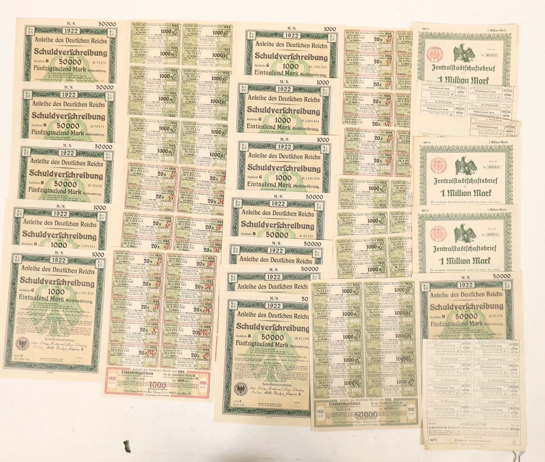 Lot of 16. All I/U, in exc. cond. Coupons included however, a couple are missing the cert. 1922 German Empire Bonds from 1000 to One Million marks. In consecutive order by bond denomination. As with others of this era all have green underprint and black printed seal of single head eagle coat of arms. Reich is the printer. The One Million mark bonds are different : They are issued by Prussian City and signed by Prussian City officials w/embossed seal, full eagle spread wing vignette at top, red print coat of arms top left. Printed by Hanover, J. C. Konig & Ebhardt.