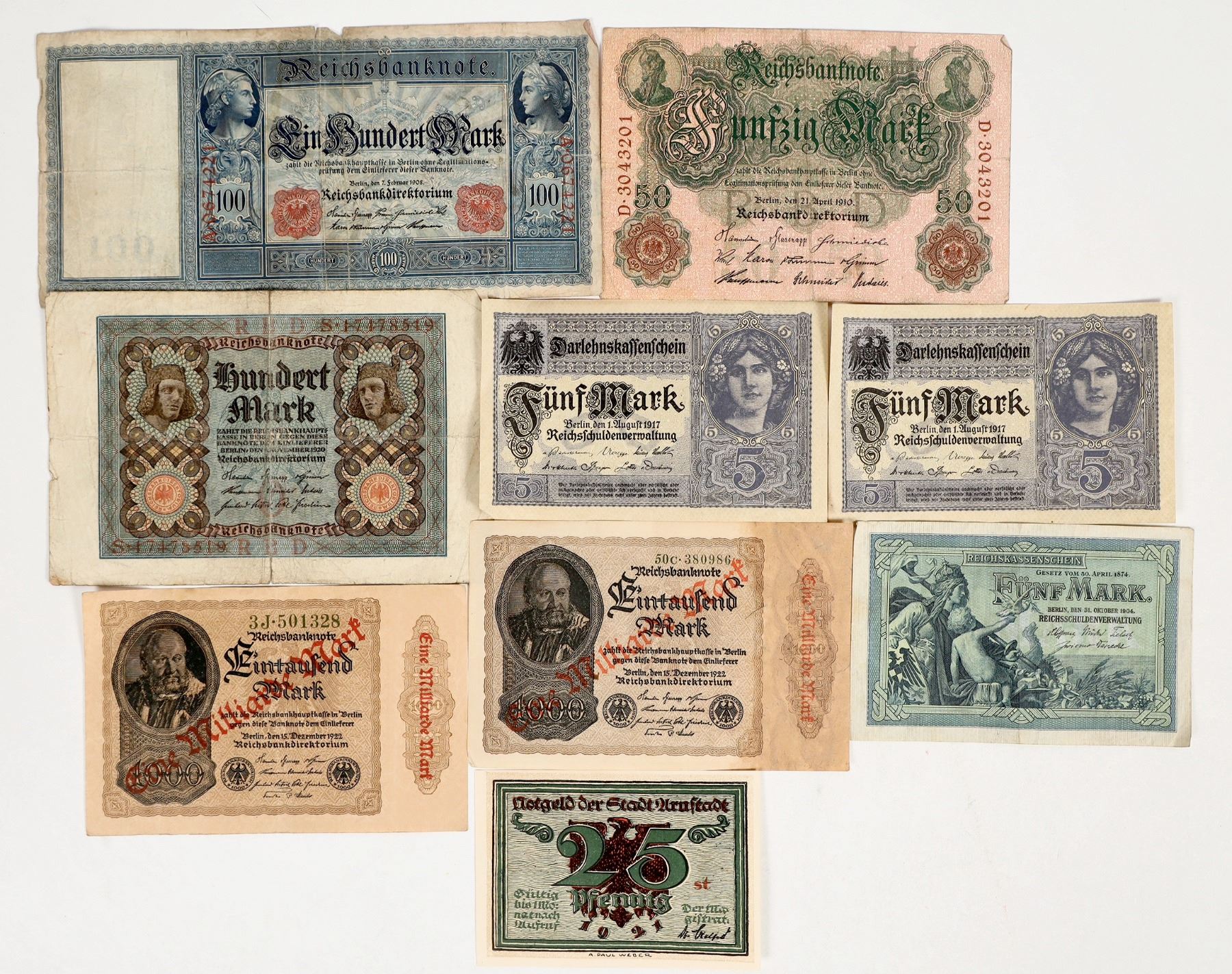 Nine pieces of German inflation currency. 1922 Eine Milliarde Mark; two examples of notgeld emergency money.