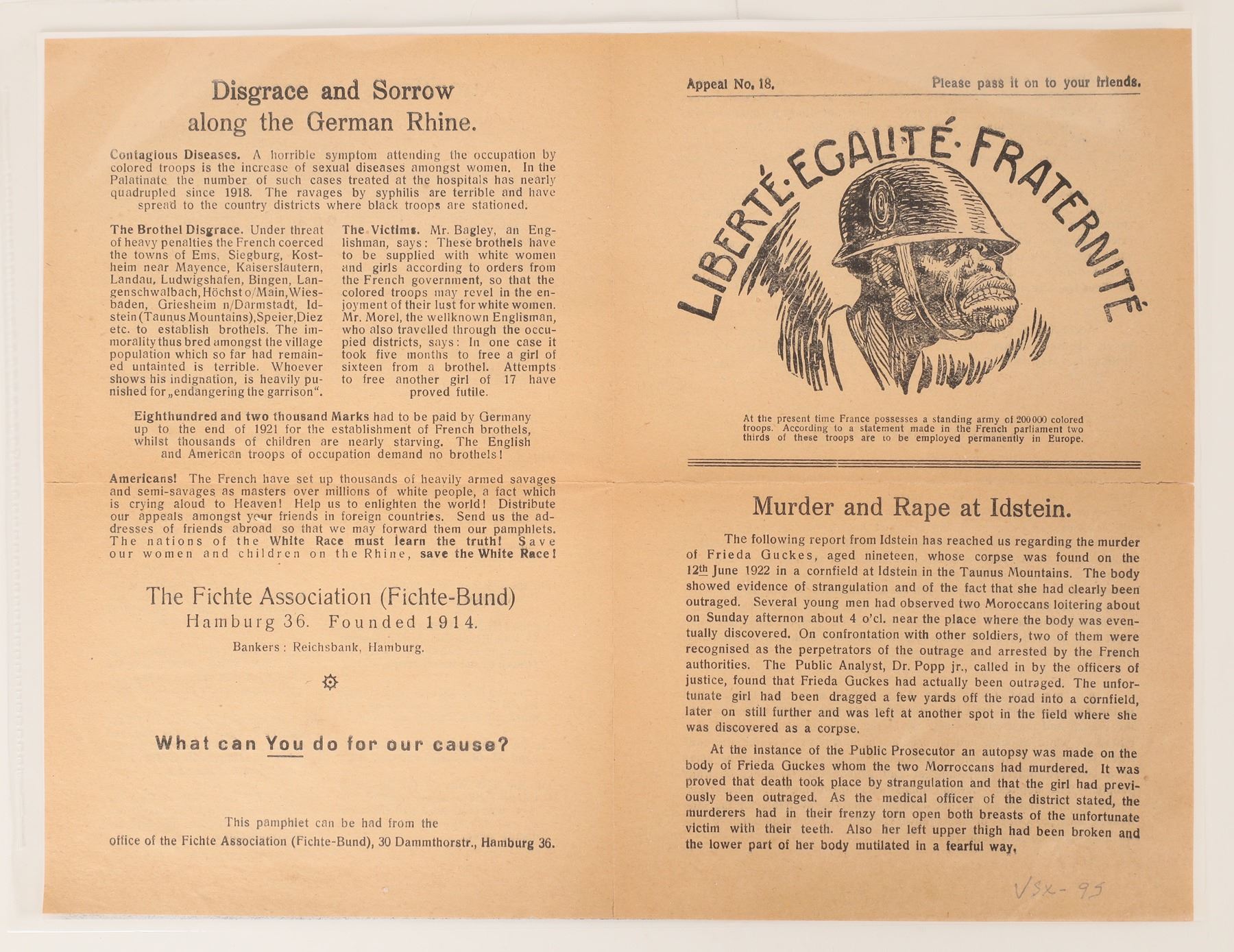 This propaganda pamphlet printed by the Fichte Association (Fichte-Bund) of Hamburg (Germany) is Appeal No. 18 and undated. This is raw propaganda. All listed examples of sexual abuse are dated 1921 pertaining to Black Frenchmen and American soldiers. The intent was to keep the "White Race" pure and disgracing racial equality two decades before the second world war. Four pages of racial propaganda in a folded pamphlet 8.5 in. X 11 in. "Please pass it on to your friends". Germany
