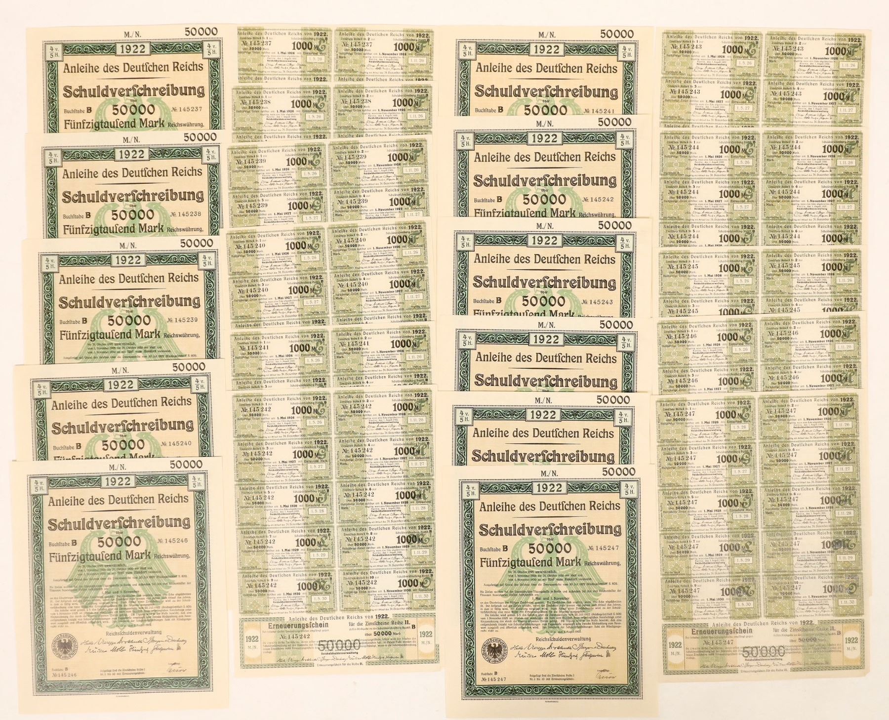 Lot of 11. All are I/U and in exc. condition. The bonds are in consecutive order #145 237-247. Single head eagle Coat of Arms in green underprint and black printed seal. Printed signatures of the Reich Administration. Reich is the printer.