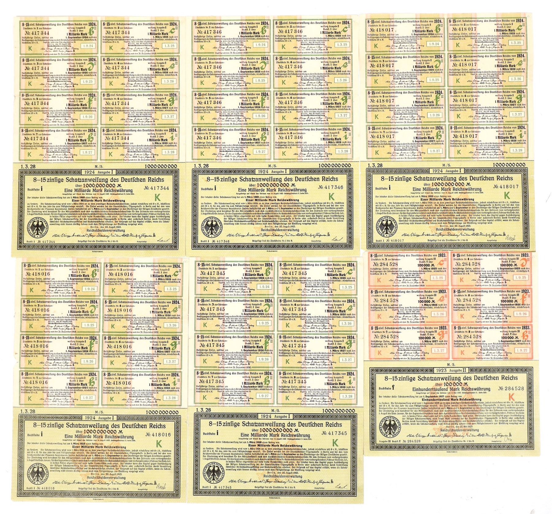 Lot of 6. One 100,000 Marks , remainder are One Billion Marks notes, coupons attached. Issued 1923 and redeemable by different coupon rears and invalid after 1931. After WWI Germany had a lot of reparations to make and these were suppose to raise the capital.