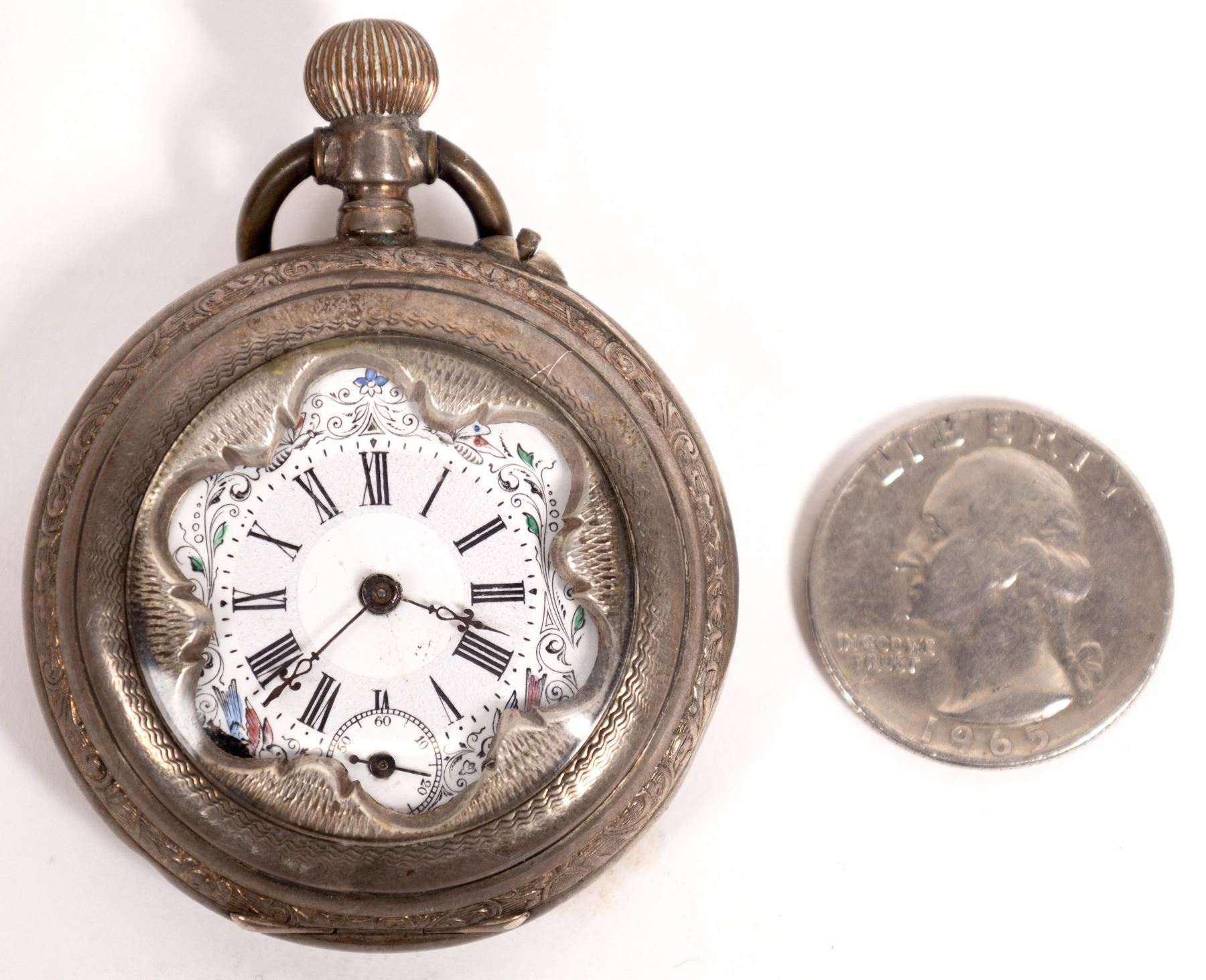 Rare and unusual silver Remontoir pocket watch. Cylinder 6 Rubis, 67754. The case has the German Silver hallmark, "Crescent / Crown". Silver, scallop design on case front with colorful floral and bird motif on enamel face. Bold black Roman numerals with second dial. Movement: Remontoir, 6 jewels, crown-wind and set by pressing the side button and turning the crown. Tarnished case. Face--1.25". State: City: Date:c 1890's Provenance: