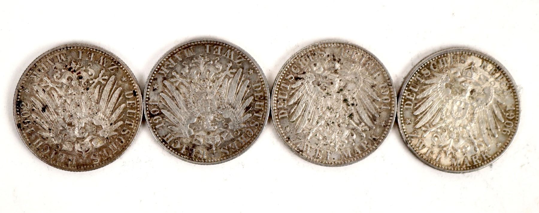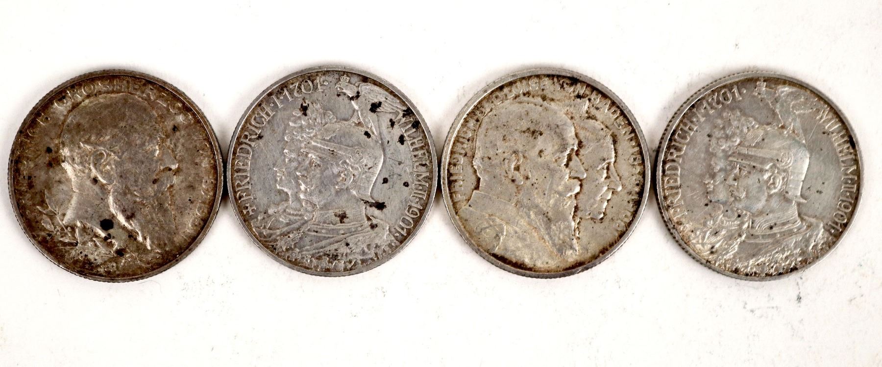 Four silver German five mark coins: 1901 Wilhelm II (2); 1902 Friedrich Grosherzog Von Baden; 1906 Von Baden. Coins are silver (.900); 27.77 grams; 38 mm.