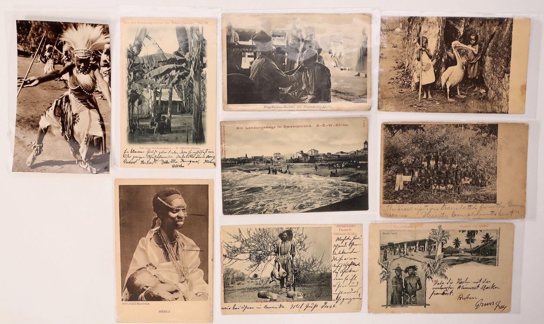 9 German South Africa postcards, 4 are not split back. Half are RPC's. Natives, hunter with game, beach, dance ceremony etc.[ Germany