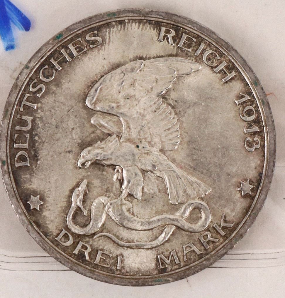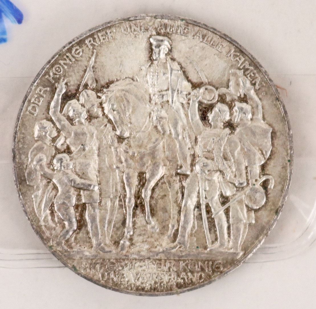 Obverse: Eagle with snake in talons, denomination below; Reverse: Figure on horseback surrounded by people; Edge Lettering: GOTT MIT UNS. Composition: Silver (0.900); 16.6670 grams; ASW: 0.4823oz; 33mm. F-EF condition. This commemorative coin, also known as "The King Called", marks the centenary of King Frederick William III's appeal "To My People" in Breslau, which lead to the declaration of war against Napoleon's France.