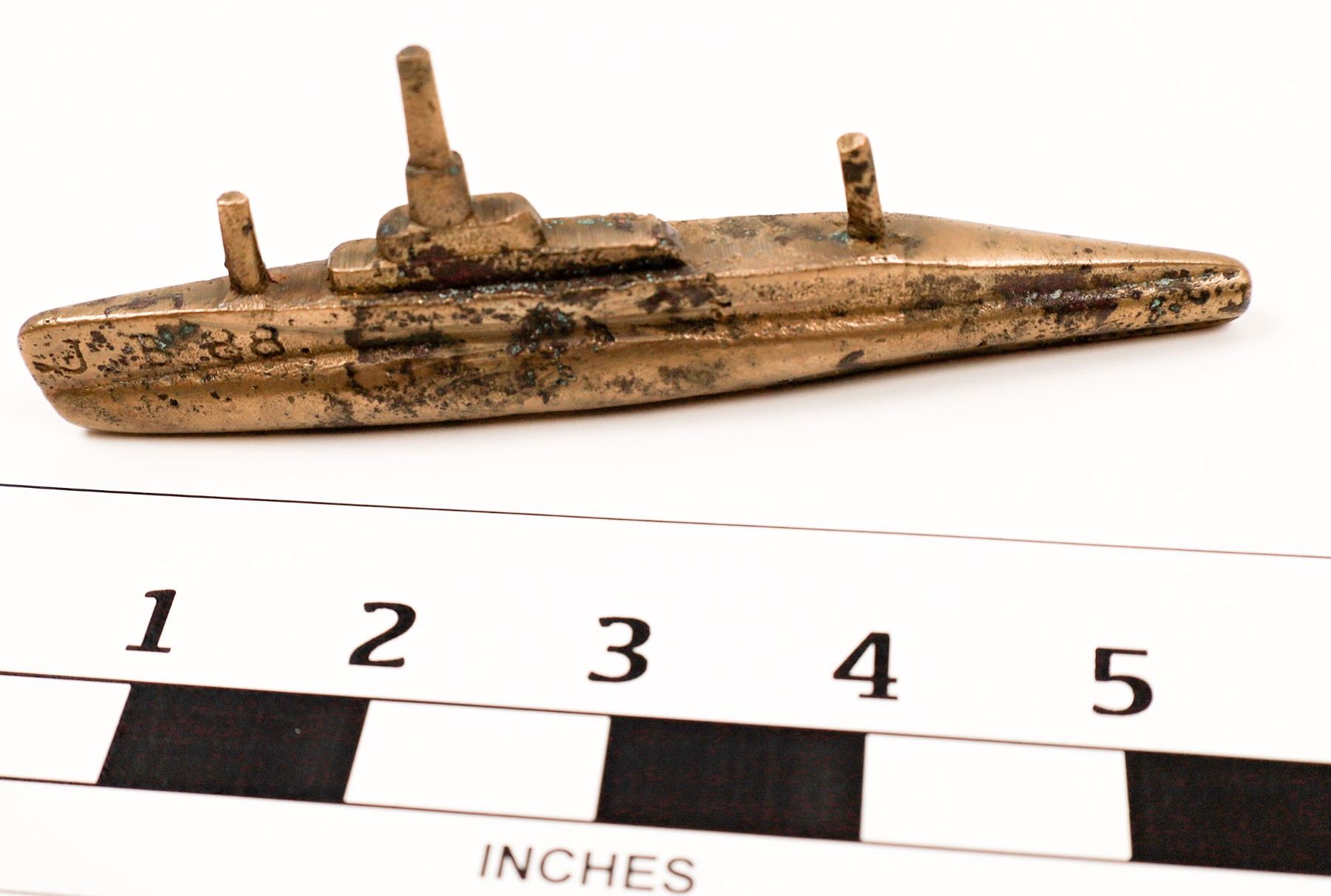 This is a miniature scale bronze of the surrendered German U-boat UB-88 given as a commemorative for the retiring US Naval Officer Commander Chauncey Shackford in 1921. Contrary to common belief, these miniature submarines were not made from salvaged bronze from the original vessel. The UB-88 surrendered to the British sixteen days after the WW1 armistice of November 11, 1918. The UB-88 along with four other German U-boats were sent to varied destinations in the United States for public display and exhibition. About 4,000-5,000 of these bronzes were cast. This is your chance to own a very rare piece of naval history. Any sailor of valor must own this bronze. Patinated and uncleaned.