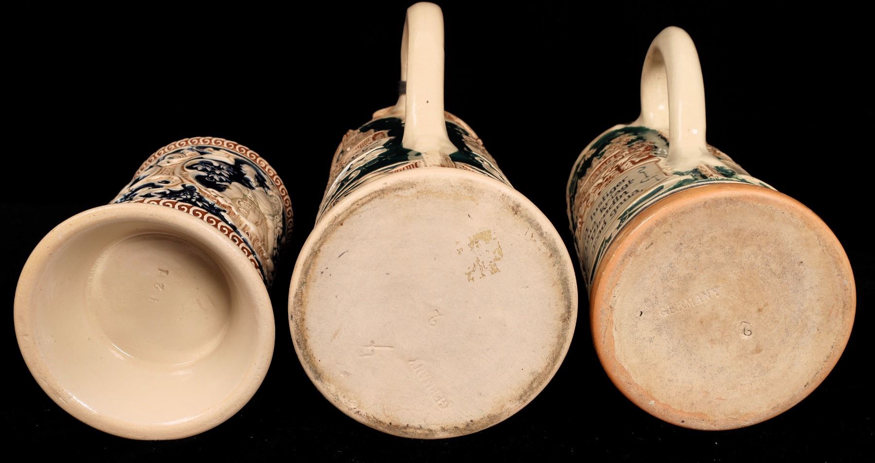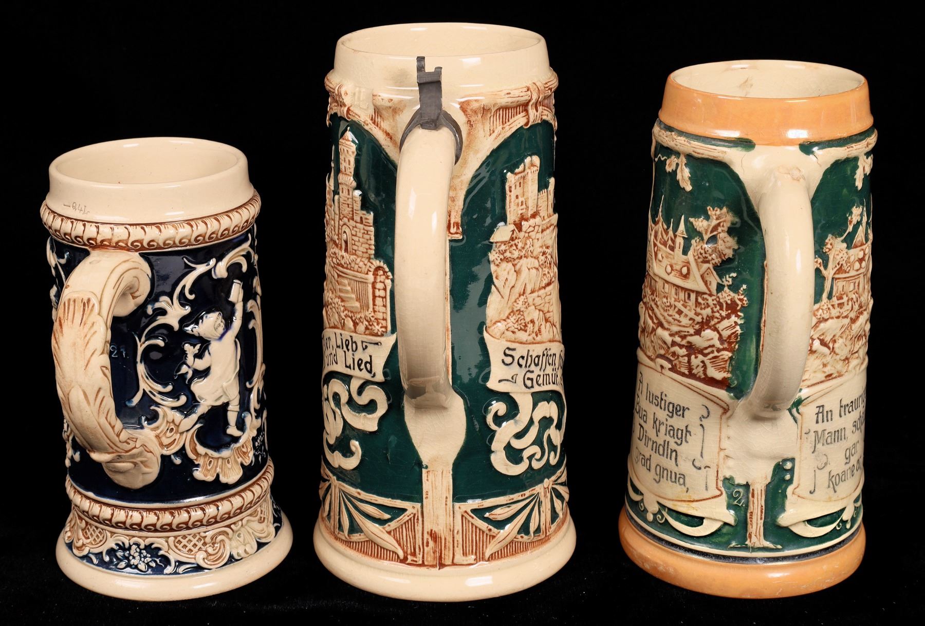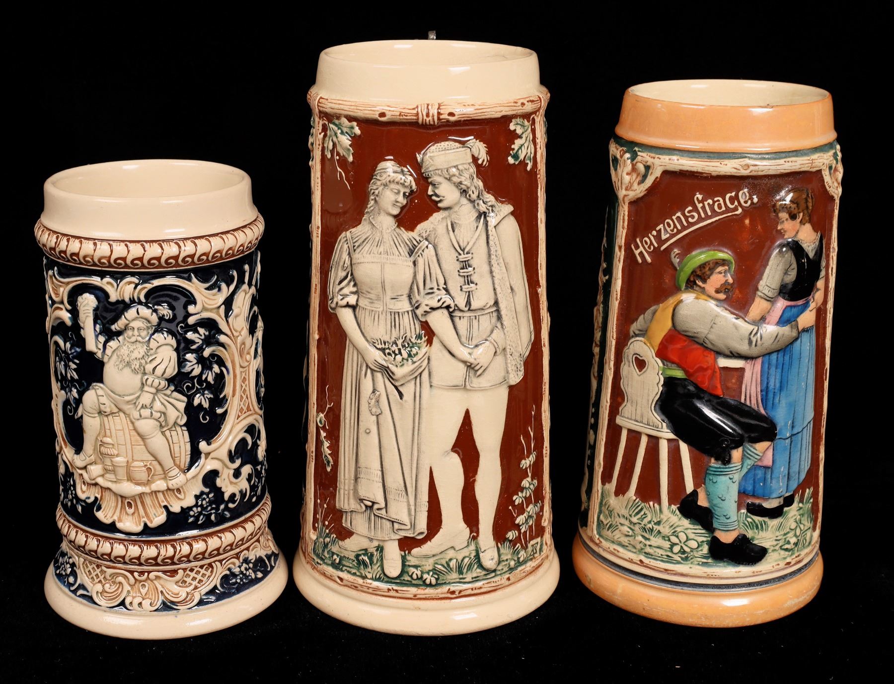 3 classic embossed c. 1900-10 German beer steins. 2 brown couples, 7.75"-1 has light 1.5" internal crack, the other has light 1" internal crack. Blue trio of people, 6.5". No other apparent chips or cracks. No lids.