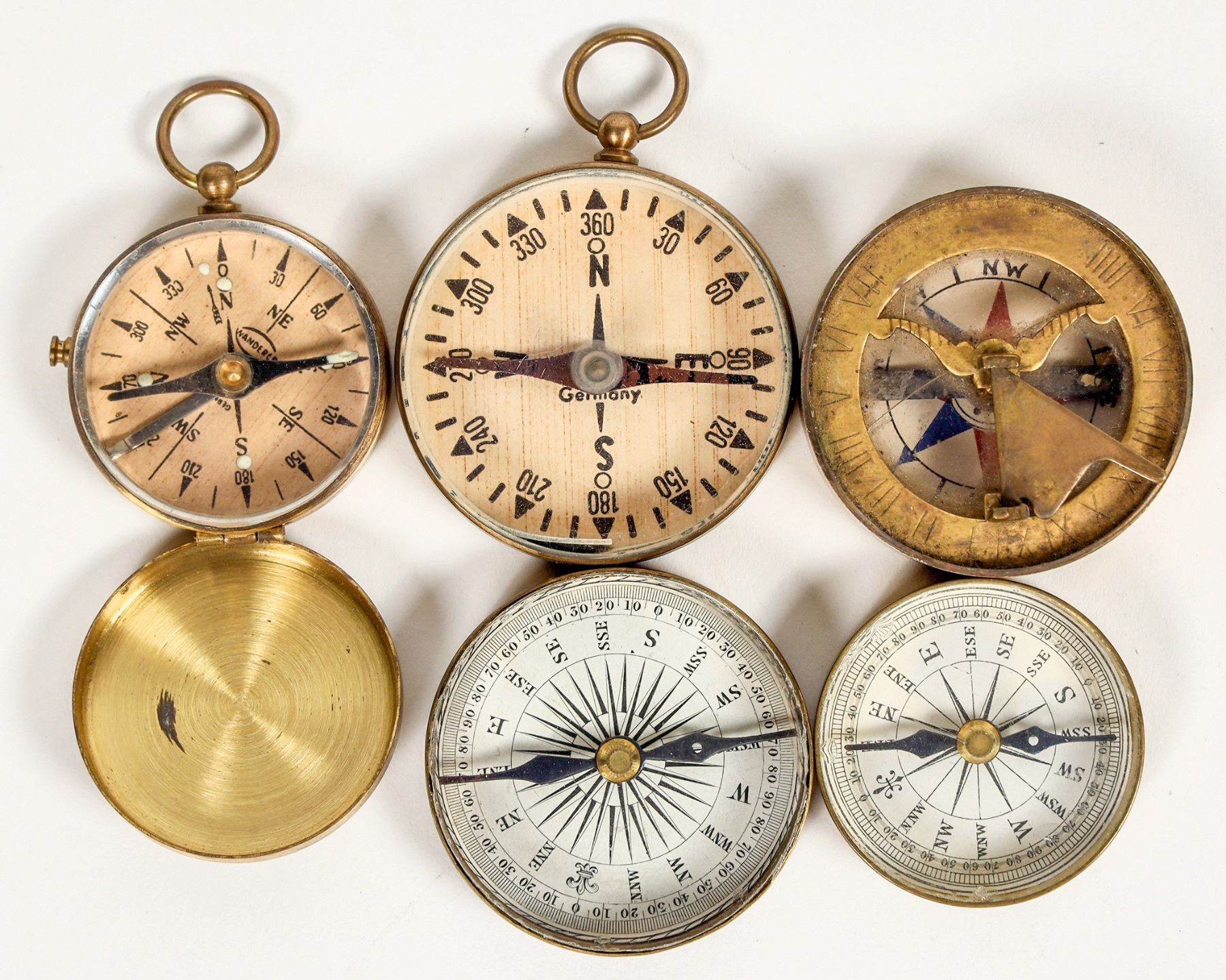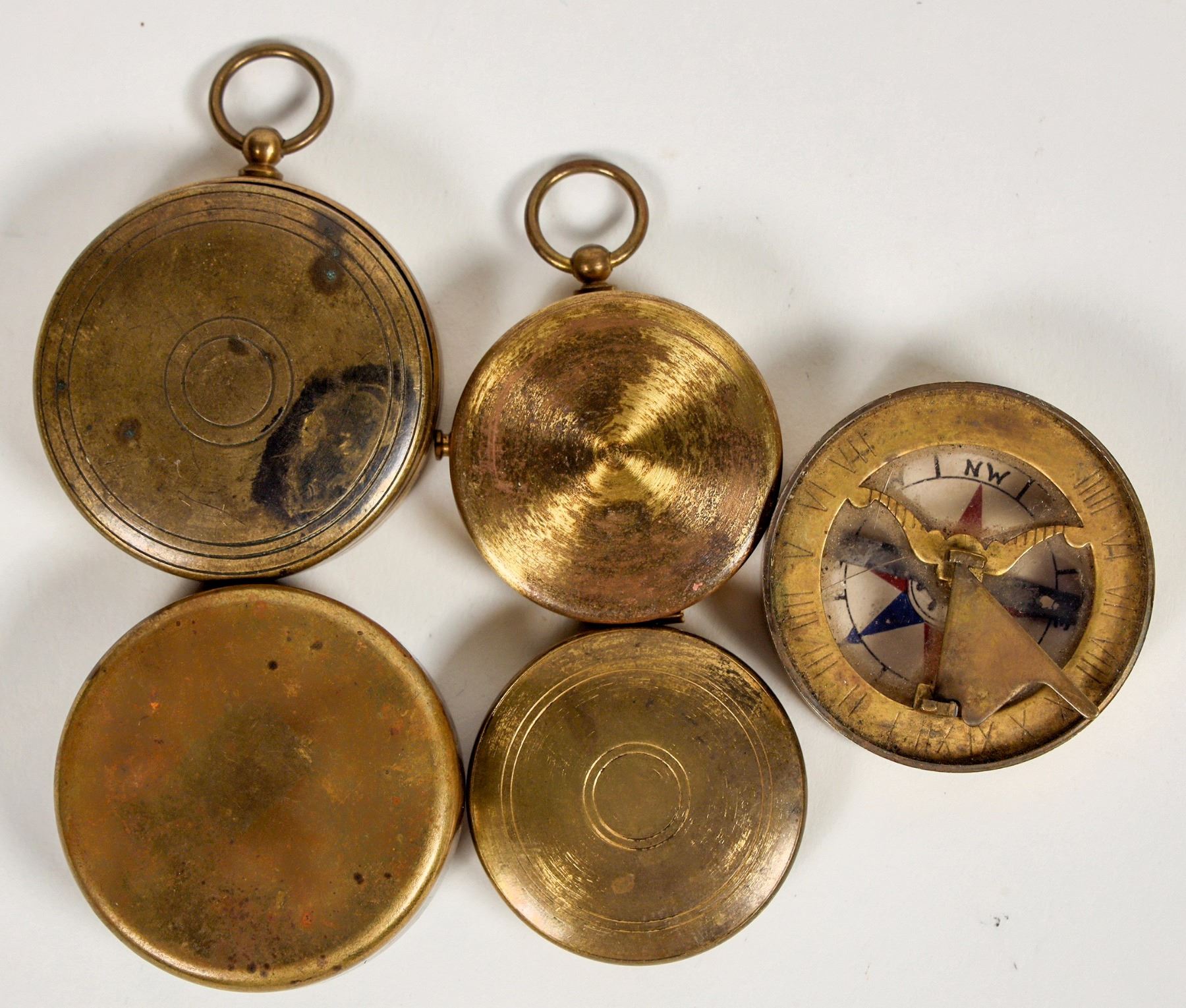 This group of pocket compasses are made in Germany (2) and France (3). The two German compasses are still accurate while the others are not. One compass has a sundial gnomon. All brass base construction. The compass cards are beautiful. c. 1920s. Please see photos for details.