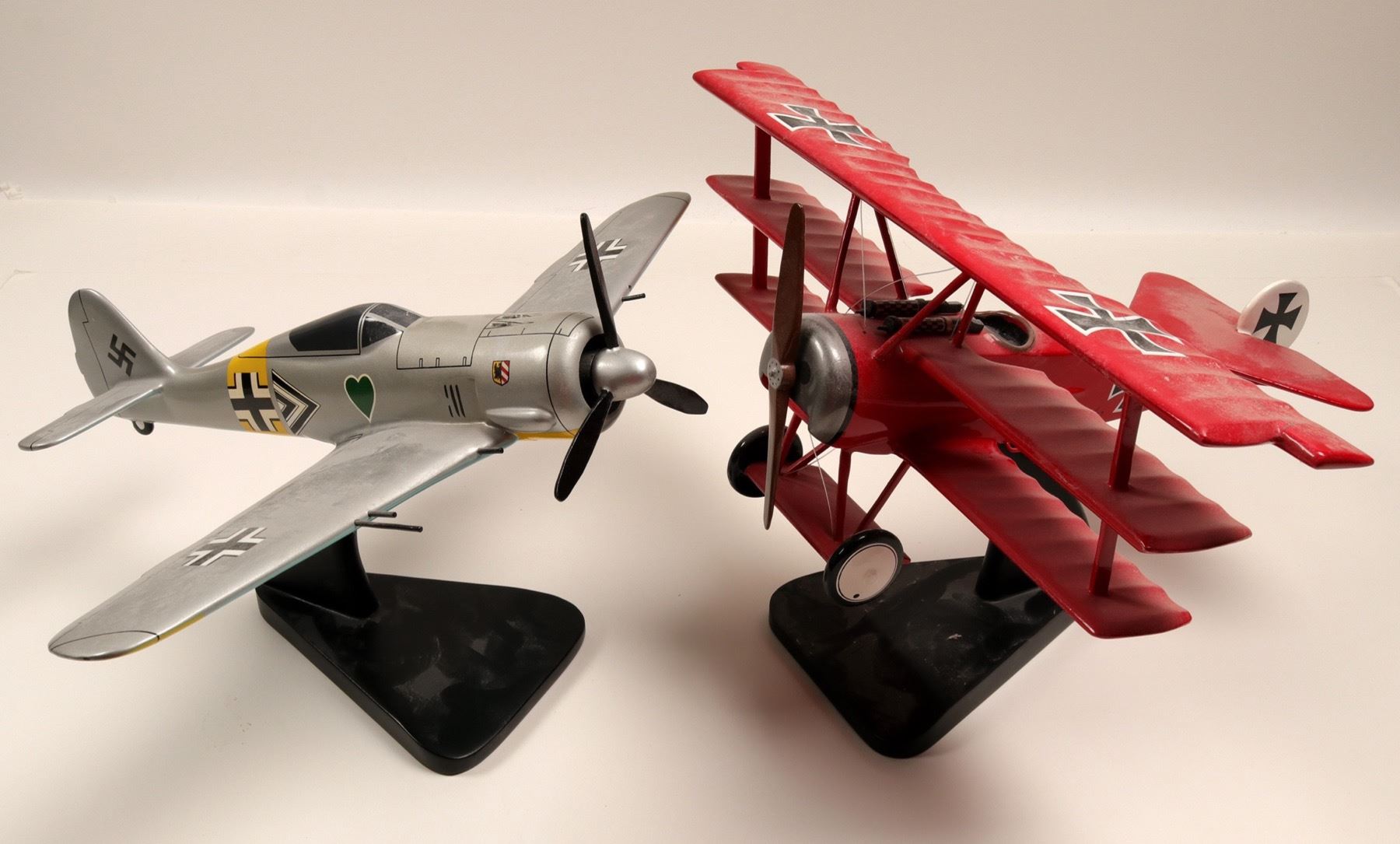 Two desk model planes w/stands in excellent condition. 1. Fokker DR-1 Triplane in red markings. 2. Possible Curtis Hawk w/German markings. Stand included. City: State: Date: 1920-40's