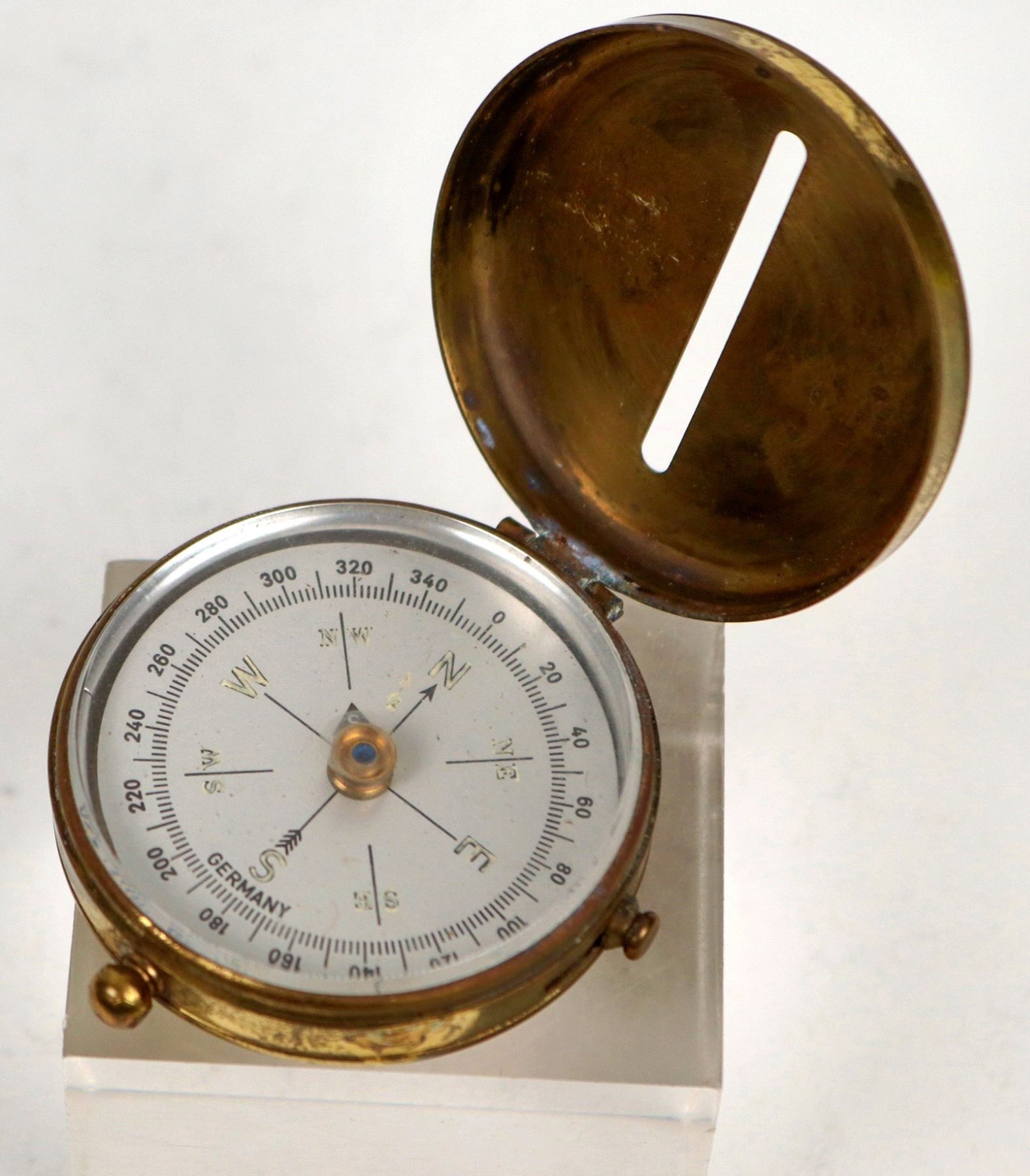 This is a small pocket compass at 1.75 in. in diameter. The cover is made with a sight window for orienteering. There is a needle stop for the card, and the degree scale indicates a 12 degree west inclination. The maker appears to to be "S" inside a triangle. In working order. Please see photo for details.