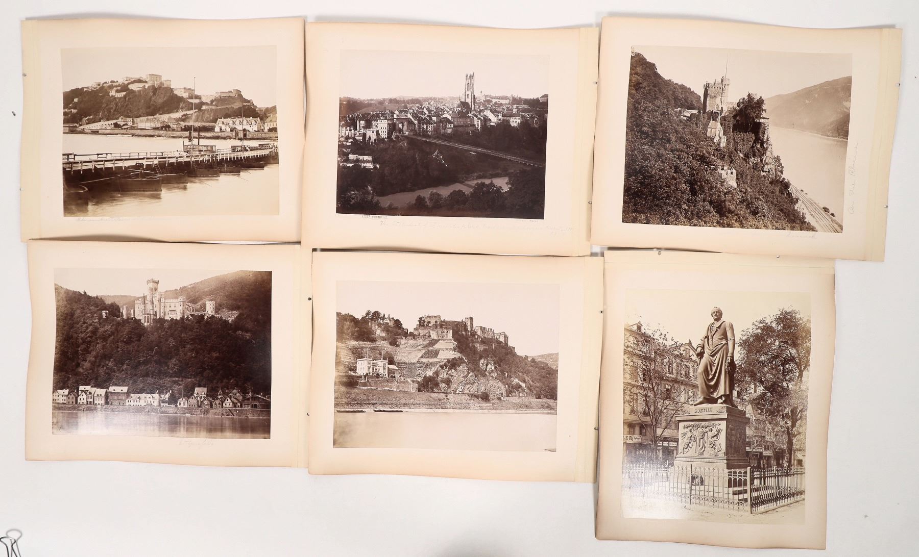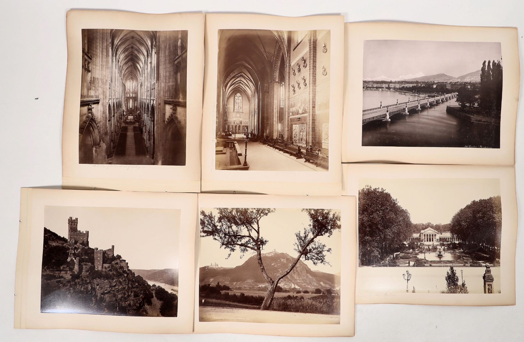 12 large Germany, no Berlin, professional photos with some pencil inscriptions below. No photographer noted. 7.25x10", mounted on both side of album page. Ruins with vineyard, Siebengebirge, Drachenfels and Drachenburg. Dam?, Cathedral of Cologne, Rhine River, Casino, Stolzenfels, castle, Goethe monument, Frankfort cathedral, Freiburg cathedral, bridge. Mat has warpage.