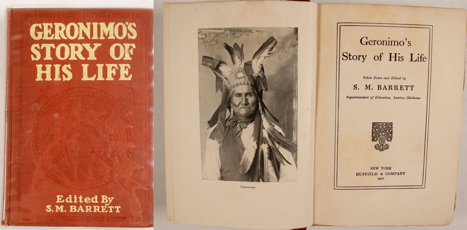 Hardback book of Geronimos' Story of His Life, Edited by S.M. Barrett,2nd Ed. pp. 216, deckle edges, includes black & white photos, includes "Kaytah" & Mahteen" Apache Scouts who were with Gen. Lawton, "Dressed as in Days of Old" & many more photos. Interesting read for those studying Geronimo's Story. 5.75" x 7.75". City: State: Date: 1907