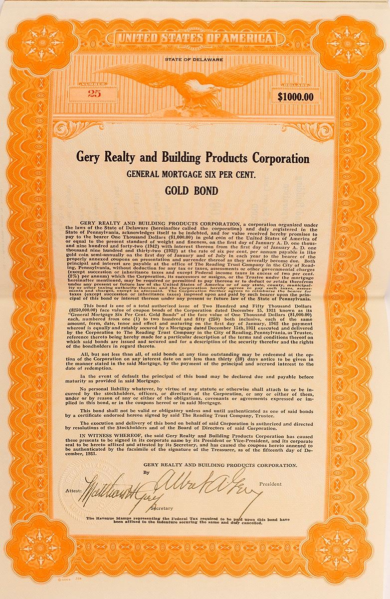 1 Gold Bond for $1000.00 with 20 revenue stamps attached. 9.5" x 15.5". Date: 1931 Location: Reading, Pennsylvania HWAC# 53727