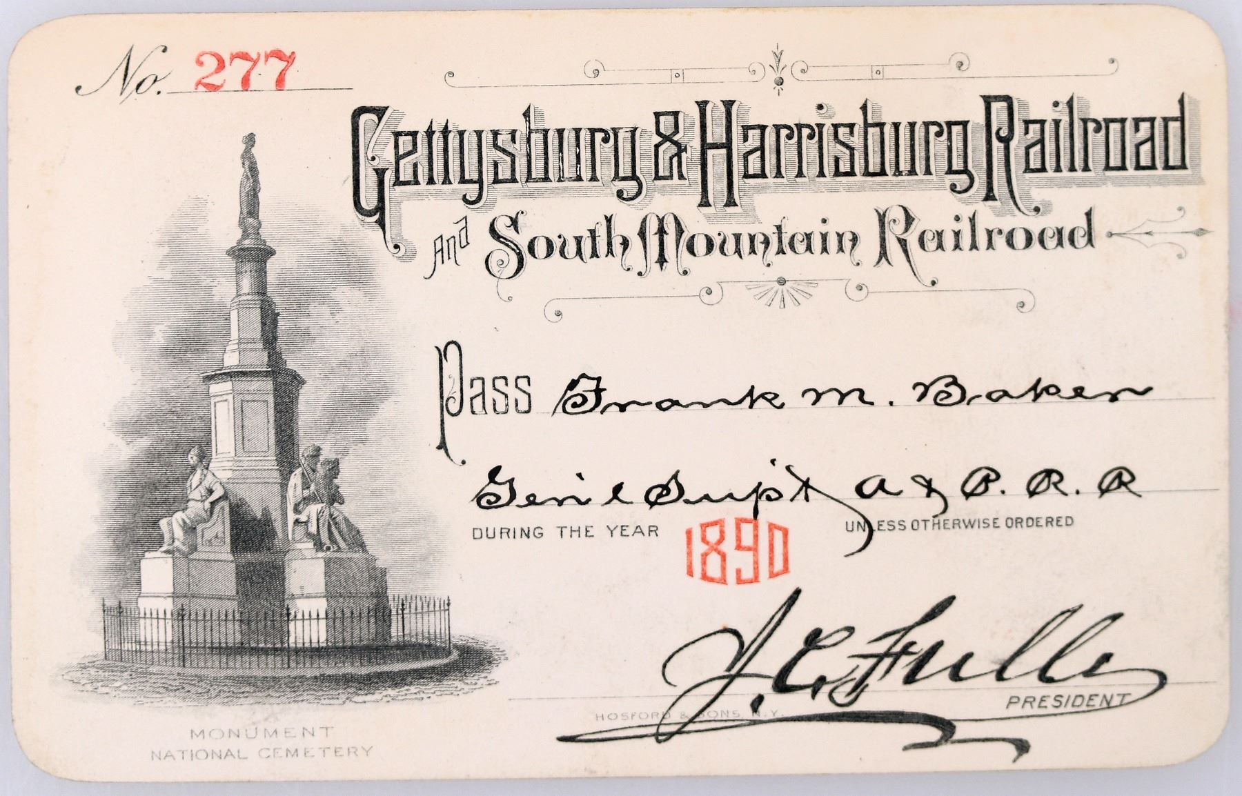 No. 277, issued to Frank Baker for the year 1890. Signed by the president JC Fuller. Black and red print on cardstock with interesting vignette of the Soldiers' National Monument at the Gettysburg National Cemetery. Printed on cardstock by Hosford & Sons. Some toning on reverse. Chartered in 1882. Line from Hunter's Run to Gettysburg, with the South Mountain Railroad serving as the north junction.