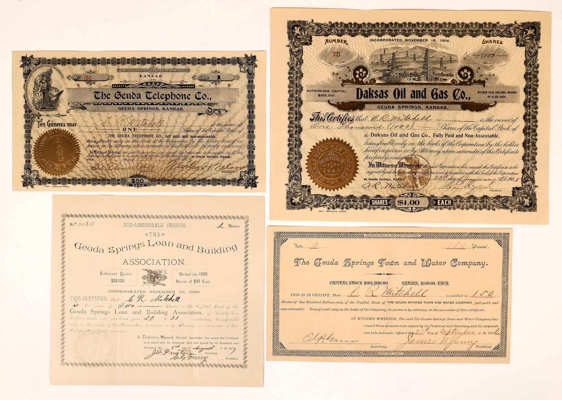Lot of 4 different. Located on the line between Cowley and Sumner counties with a famous group of salt springs. 1) Geuda Springs Town and Water Company. Low cert. number 3, issued to CR Mitchell in 1886. Signed by president James Young and the secretary. Not cancelled. 2) Geuda Springs Loan and Building Association. Stock issued to CR Mitchell in 1887. Signed by president Furry and secretary Preston. Not cancelled. 3) Daksas Oil and Gas Company. Issued to secretary CR Mitchell in 1905. Also signed by president HL Ryan. Not cancelled. Oil field vignette. 4) The Geuda Telephone Company. Issued to CR Mitchell in 1906. Signed by president Martin Nelson and secretary Holt. Not cancelled. Please inspect.